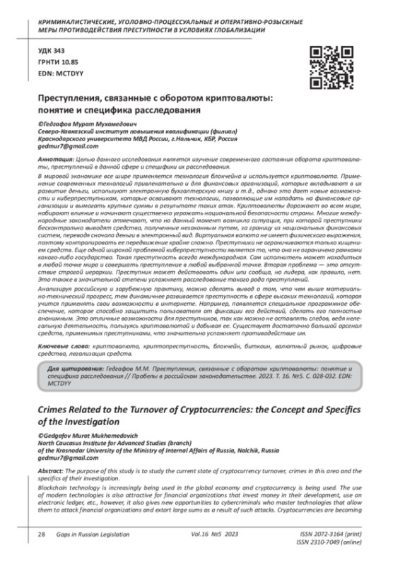 4. Долгиева М.М. Криптопреступность как новый вид преступности: понятие, специфика // Современное право. 2018. № 10. С. 109-115. EDN: CBKUCR