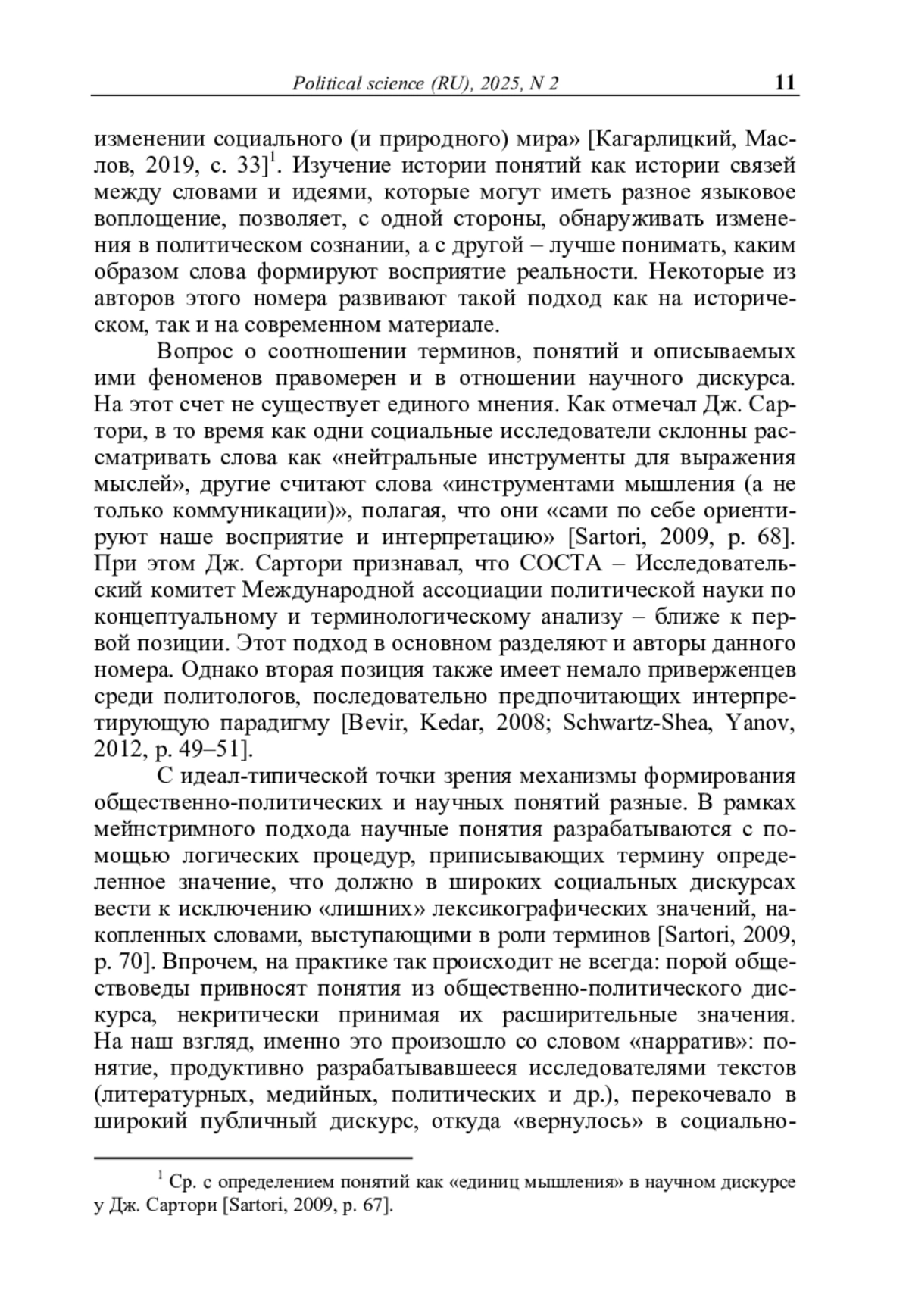 Вопрос о соотношении терминов, понятий и описываемых ими феноменов правомерен и в отношении научного дискурса. На этот счет не существует единого мнения. Как отмечал Дж. Сартори, в то время как одни социальные исследователи склонны рассматривать слова как «нейтральные инструменты для выражения мыслей», другие считают слова «инструментами мышления (а не только коммуникации)», полагая, что они «сами по себе ориентируют наше восприятие и интерпретацию» [Sartori, 2009, p. 68].