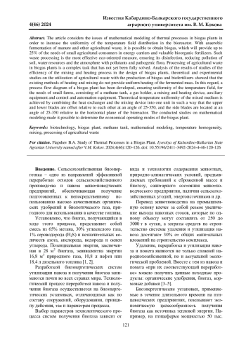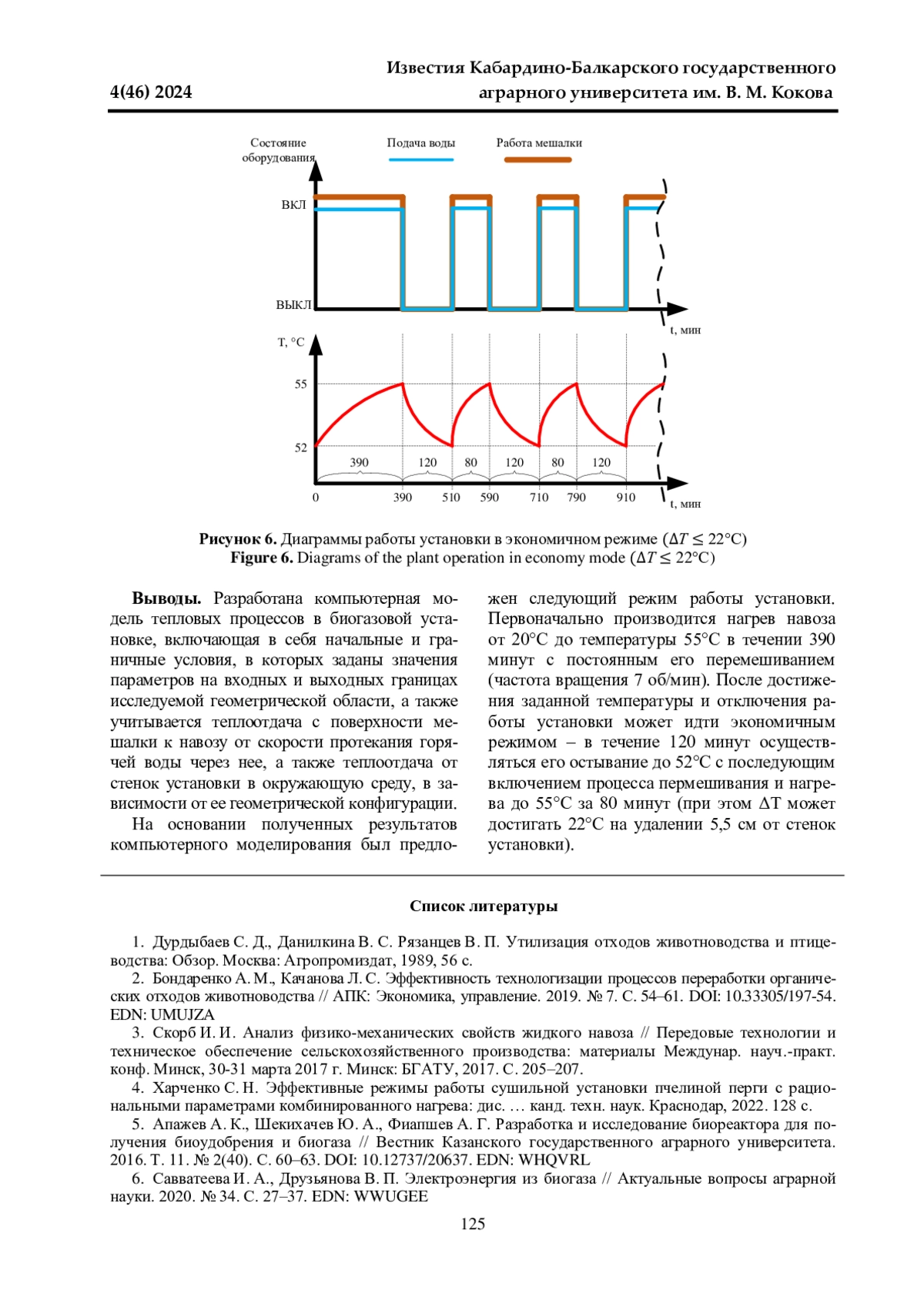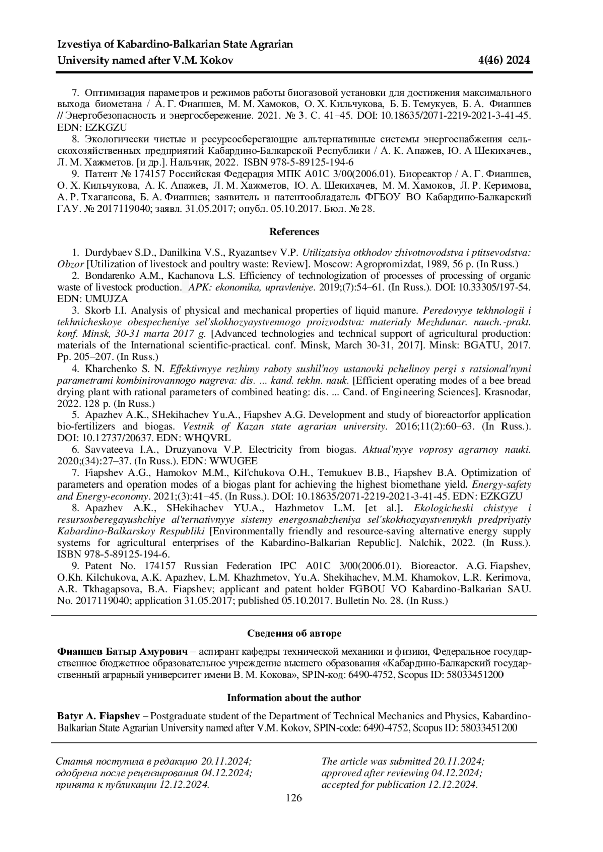 5. Апажев А. К., Шекихачев Ю. А., Фиапшев А. Г. Разработка и исследование биореактора для получения биоудобрения и биогаза // Вестник Казанского государственного аграрного университета. 2016. Т. 11. № 2(40). С. 60-63. DOI: 10.12737/20637 EDN: WHQVRL