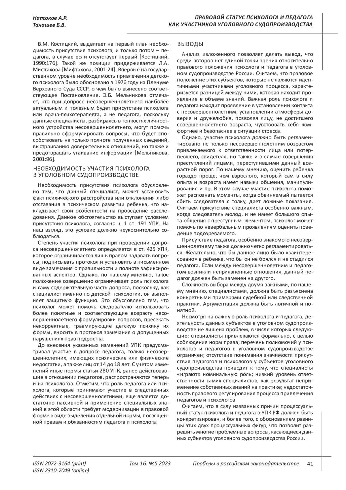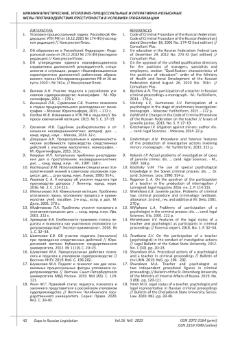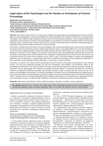 17. Шувалова М.А. Педагог и психолог как две независимые процессуальные фигуры уголовного судопроизводства // Вестник Санкт-Петербургского университета МВД России. 2019. №3 (83). С. 120-121. EDN: EBFYMF