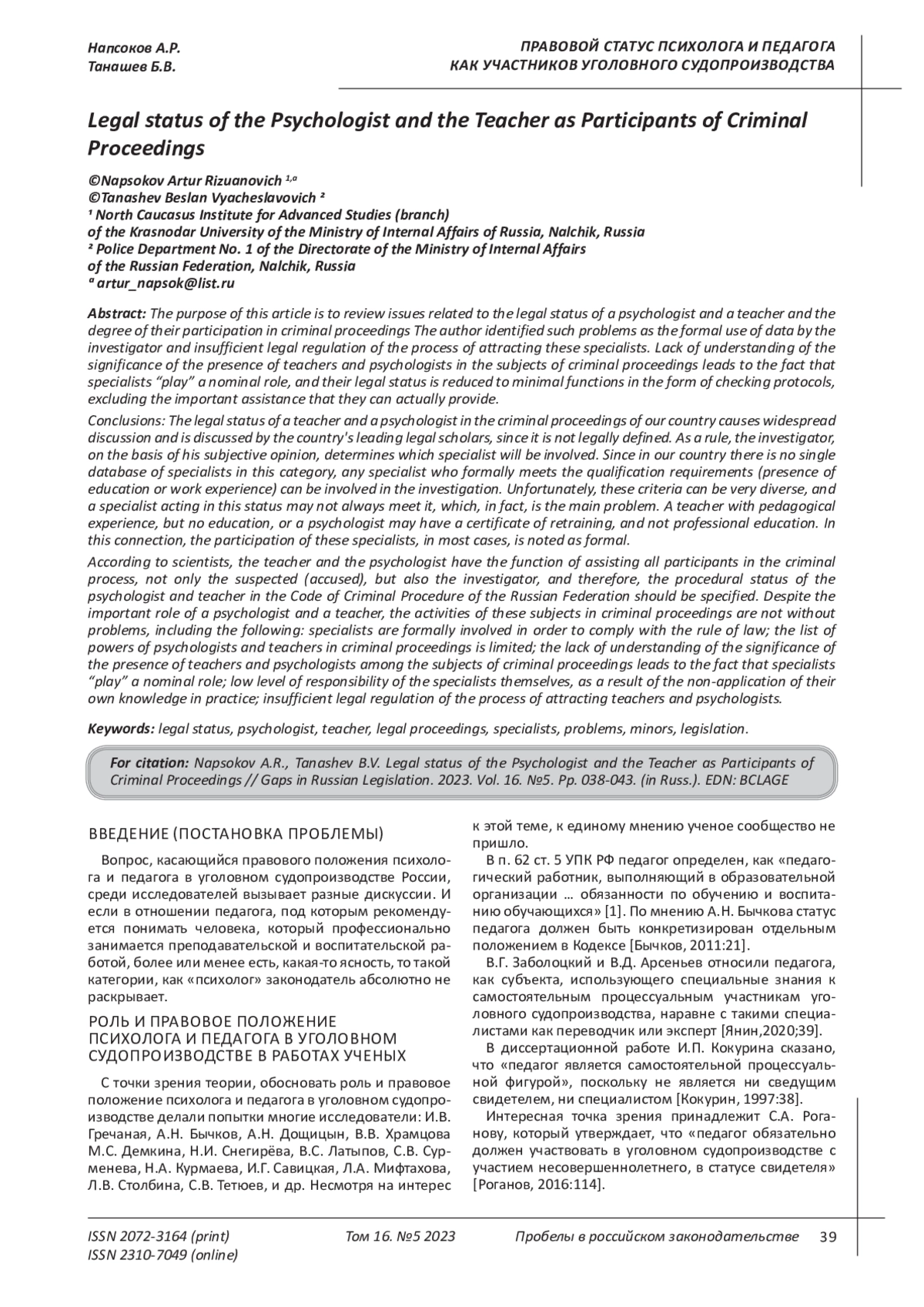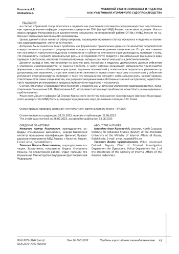 14. Храмцова В.В. Особенности правового статуса педагога и психолога как участников уголовного судопроизводства// Эксперт-криминалист. 2018. № 1. С. 32-34. EDN: YOEEAS