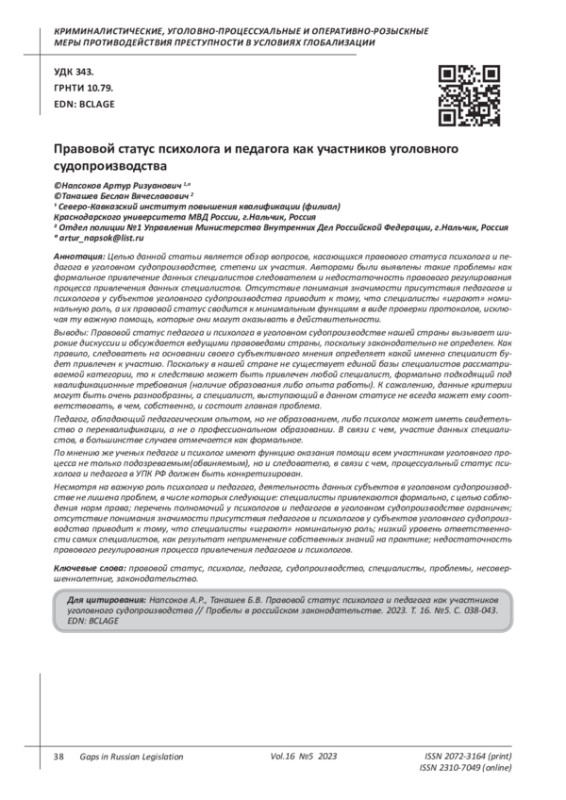 Khramtsova V.V. Features of the legal status of a teacher and psychologist as participants in criminal proceedings // Forensic expert. 2018. No. 1. P. 32-34.