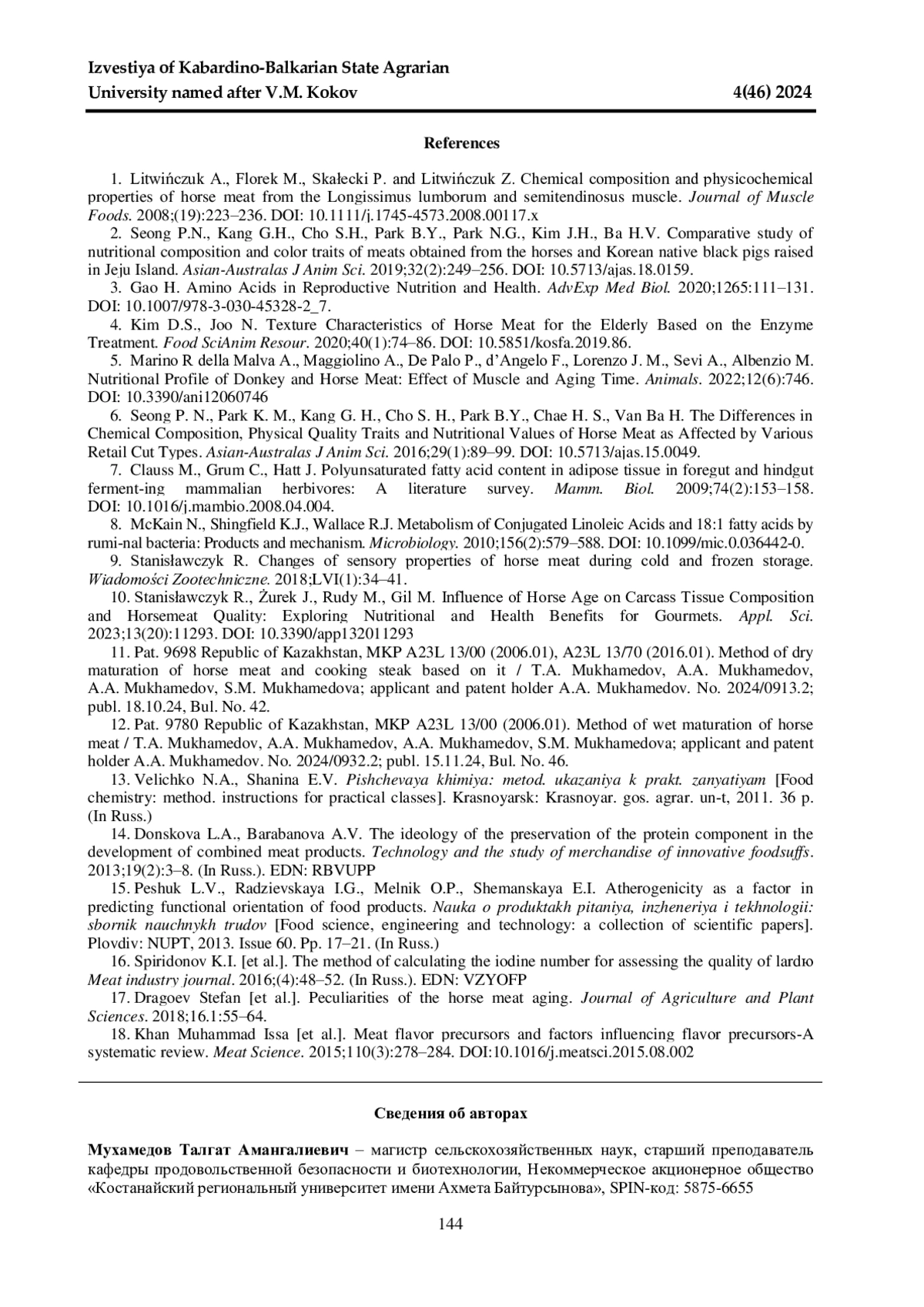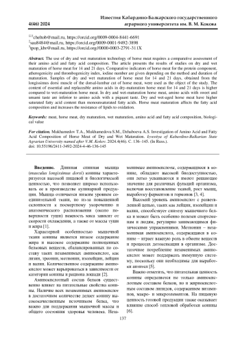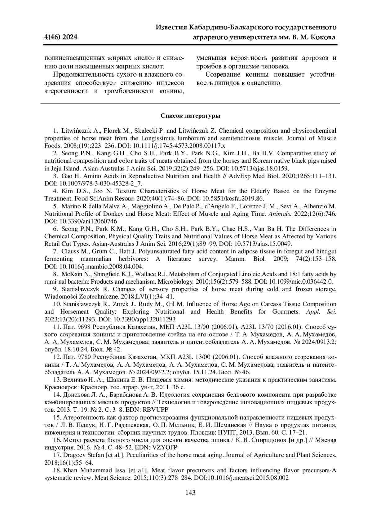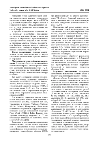 Статья: ИССЛЕДОВАНИЕ АМИНОКИСЛОТНОГО И ЖИРНОКИСЛОТНОГО СОСТАВА КОНИНЫ СУХОГО И ВЛАЖНОГО СОЗРЕВАНИЯ (2024)