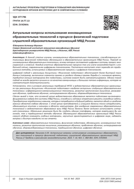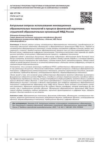 В данной статье изучены инновационные образовательные технологии, способствующие оптимизации физической подготовки обучающихся в образовательных организациях МВД России. Переход на инновационные образовательные технологии, основу которых составляют цифровые системы процесс многогранный и сложный. Каждый участник образовательного процесса так или иначе взаимодействует с глобальной сетью, современными цифровыми технологиями. Постепенно наступает этап перехода от традиционных методов, используемых в образовательном процессе, к цифровым технологиям. Цифровой подход к реализации дисциплины «Физическая подготовка» обеспечивает более быстрый поиск данных (например, выполнение элемента приема из раздела «Боевые приемы борьбы») и экономию времени, требуется меньше материалов для подготовки, система может быть автоматизирована. Однако такой подход не всегда является лучшим из-за качества коммуникации и большого потока информации, которая не соответствует действительности. Установлено, что в условиях реализации требований ФГОС в ведомственных образовательных организациях при реализации дисциплины «Физическая подготовка» наиболее актуальны следующие образовательные технологии: информационно-коммуникационные технологии, развитие критического мышления, развивающее обучение, проблемное обучение, интегрированное обучение, здоровьесберегающие технологии. Сделан вывод о том, что основной целью ведомственного образования является подготовка высококвалифицированных кадров для системы МВД России, способных и готовых оперативно решать служебные задачи. Приобретение определенных навыков, которые потребуются в будущей работе, является одной из наиболее важных областей любого обучения. С этой целью преподаватель и учащиеся должны тесно сотрудничать, обмениваться опытом и знаниями в области компьютеров. Для внедрения современных образовательных технологий в ведомственное образование вузы МВД России должны более активно использовать интернет-технологии. Идеальным решением было бы создать единую платформу, которая охватывала бы как онлайн, так и традиционные методы обучения. Обучающиеся образовательных организаций МВД России смогут удобнее осваивать учебные материалы, научиться ориентироваться в цифровом мире, задавать вопросы и быстро находить на них ответы.