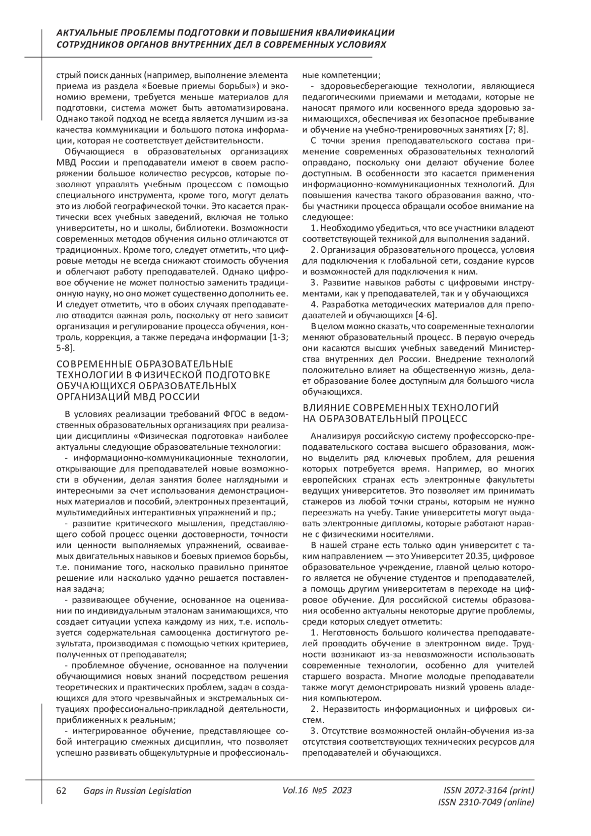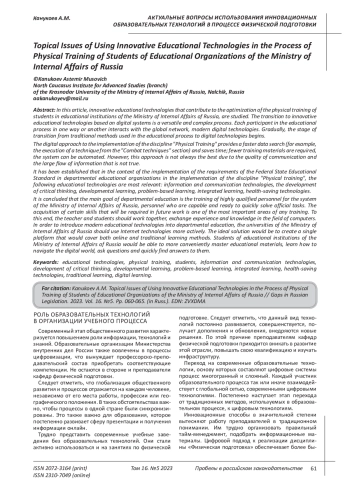 В данной статье изучены вопросы совершенствования профессионального мастерства преподавателей физической подготовки и система преподавания боевых приемов борьбы обучающимся в образовательных организациях МВД России. Современные реалии деятельности полицейских обуславливают необходимость решения проблем, связанных с ростом противодействия преступных элементов с использованием различных условий обстановки и обстоятельств. Это, в свою очередь, предполагает наличие высоких показателей физической и психологической подготовленности сотрудников полиции, которые выполняют свои оперативно-служебные обязанности по обеспечению общественного порядка и общественной безопасности. В этой связи растет спрос на физическую подготовленность специалистов. Физическая подготовленность сотрудников полиции в образовательных организациях МВД России направлена на формирование определенных навыков, в том числе и приемов борьбы. Обучение полицейских приемам борьбы является важной частью тренировок, проводимых в институтах повышения квалификации по всему миру. Это помогает офицерам развивать навыки самозащиты и определенные техники, которые могут пригодиться в процессе задержания или необходимости применения физической силы. Установлено, что полицейские могут использовать социальные сети и другие онлайн-ресурсы для сбора информации, анализа данных и принятия более точных решений. Современные технологии играют огромную роль в различных сферах жизни, в том числе в процессе обучения полицейских приемам борьбы. Они помогают сделать обучение более эффективным и интересным, что в свою очередь может повысить эффективность работы полицейских и обеспечить безопасность общества. Еще одной важной технологией является использование видеонаблюдения и анализа действий. Это помогает выявлять ошибки и недочеты в работе полицейских, а также даёт возможность оценивать их эффективность в реальных ситуациях. Кроме того, анализ видео может помочь определить, какой прием борьбы был наиболее эффективным в конкретной ситуации и использовать его в будущих тренировках.