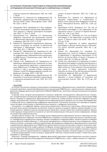 9. Панова О.С., Мануйленко Э.В., Лемайкина С.В., Демьянова Л.М., Лунин А.А. Проблемы и перспективы цифровизации в образовательных организациях МВД России // Перспективы науки. 2022. № 11 (158). С. 196-199. EDN: YKLSJO