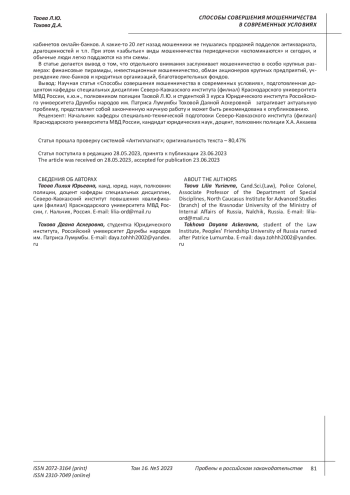 Целью данной статьи является рассмотрение способов совершения мошенничества, которые представляют особый интерес, поскольку их разнообразие открывает широкие «перспективы» для изучения, в том числе следователями, ведущими расследования дел данной категории. Масштабы деятельности преступников раскрываются именно посредством способа совершения, поскольку его эффективность позволяет получить максимальную прибыль, а легальный, на первый взгляд, характер этой деятельности дает возможность длительного ее существования. Авторы приводят различные классификации, предложенные правоведами разных периодов времени, поскольку наблюдаются разные тенденции в способах мошенничества. Сегодня наблюдается рост мошенничества в сфере компьютерных и интернет-технологий, взломы аккаунтов и личных кабинетов онлайн-банков. А какие-то 20 лет назад мошенники не гнушались продажей подделок антиквариата, драгоценностей и т. п. При этом «забытые» виды мошенничества периодически «вспоминаются» и сегодня, и обычные люди легко поддаются на эти схемы. Выводы: Широкий спектр способов совершения мошенничества позволяет преступникам «орудовать» как на рынке вещевом, так и на финансовом. Амбиции отдельных лиц настолько велики, что мошенничество совершается в особо крупных размерах, а пострадавшими начинают выступать уже тысячи людей, примером чего являются жертвы финансовых пирамид, обманутые дольщики и пр. Нередко потерпевшими выступают даже известные люди, артисты, которые попадаются на покупке поддельных драгоценностей или брендовых вещей. Мошенники не гнушаются даже тем, что готовы лишить людей последнего жилья или различных сертификатов, для этого предназначенных, таких как жилищные или материнские. К сожалению, достаточно низкий уровень жизни граждан нашей страны нередко подталкивает их получение легких денег, которые предлагают мошенники поэтому люди «ведутся» на беспроигрышные лотереи, рекламные акции, бесплатное обслуживание, подарки и прочее, где результатом становятся оформление многомиллионных кредитов, и потеря имущества. Отдельного внимания требует мошенничество в сфере цифровых и компьютерных технологий: кардинг, фишинг, блокировка устройств посредством вредоносных рассылок, взлом аккаунтов и банковских приложений - это лишь малая толика способов мошенничества.