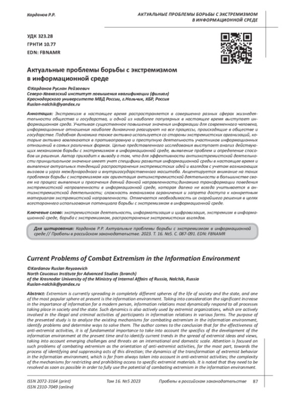 КАРДАНОВ Р. Р. АКТУАЛЬНЫЕ ПРОБЛЕМЫ БОРЬБЫ С ЭКСТРЕМИЗМОМ В ИНФОРМАЦИОННОЙ СРЕДЕ // ПРОБЕЛЫ В РОССИЙСКОМ ЗАКОНОДАТЕЛЬСТВЕ. 2023. Т. 16 № 5