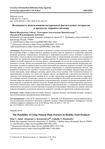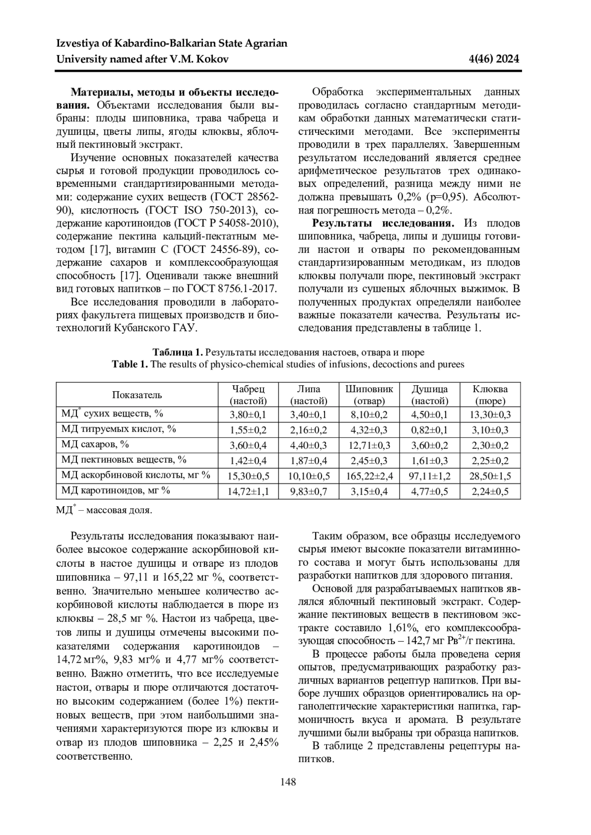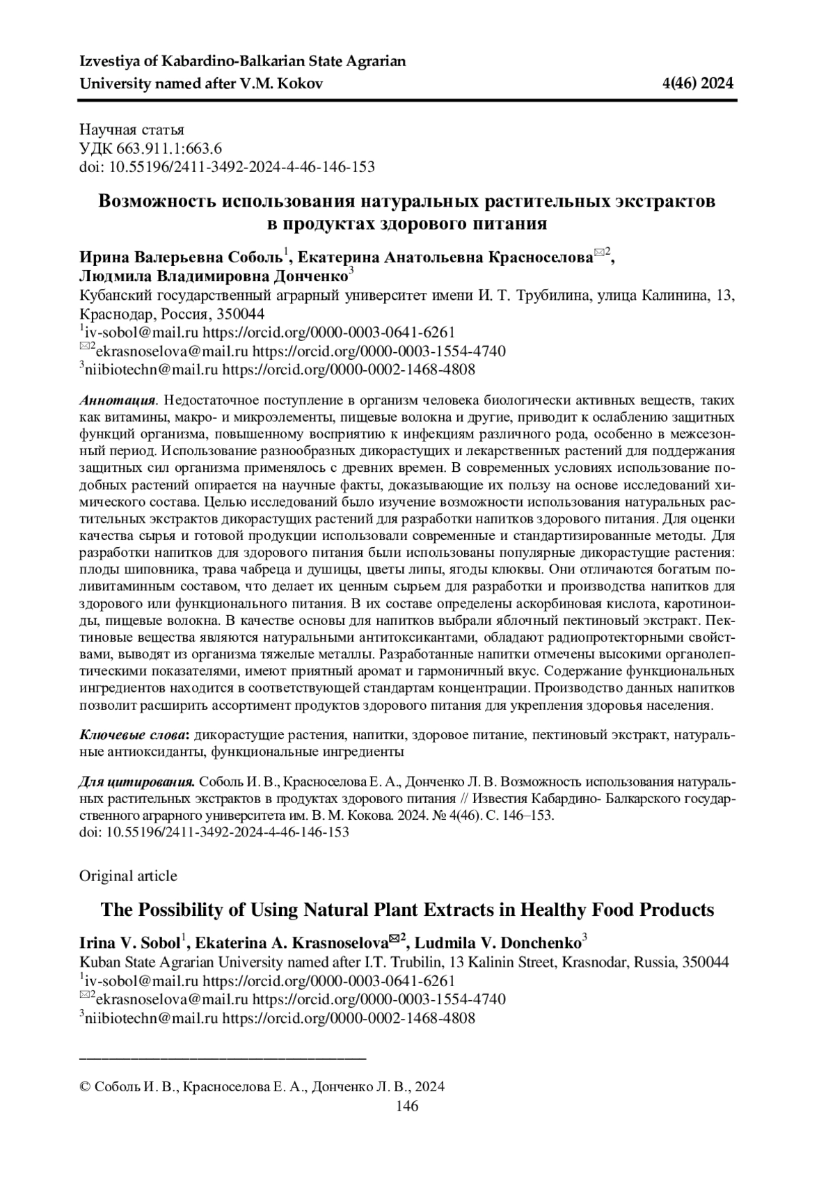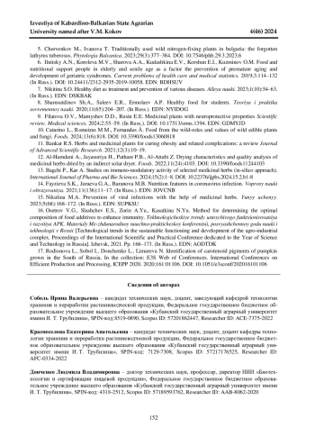 1. Donchenko L.V., Krasnoselova E.A., Konuhova E.V., Belousova A.I. Innovative technological aspects of secondary raw materials processing in juices production // В сборнике: IOP Conference Series: Earth and Environmental Science. 2020. С. 012011. DOI: 10.1088/1755-1315/488/1/012011 EDN: SYCCQW