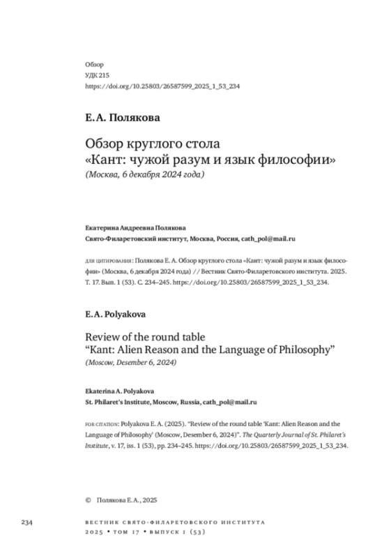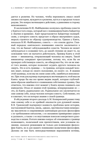 В декабре 2024 г. в Свято-Филаретовском институте прошел круглый стол, посвященный трехсотлетнему юбилею Иммануила Канта — круглой дате, ставшей поводом для множества конференций, в том числе и в России. Круглый стол был проведен кафедрой гуманитарных и естественнонаучных дисциплин богословского факультета СФИ, в нем приняли участие члены кафедры: канд. пед. наук А. М. Копировский, С. В. Андросенко, канд. филос. наук В. В. Грановский, канд. филол. наук Я. Р. Пантуева, канд. филос. наук Т. Н. Панченко, канд. филос. наук А. П. Патракова, канд. филол. наук Е. А. Полякова, канд. филос. наук В. Ю. Файбышенко, а также гости кафедры — д-р филол. наук Ю. В. Балакшина, А. С. Платанова, Е. А. Пантуева, канд. филол. наук И. М. Полякова.