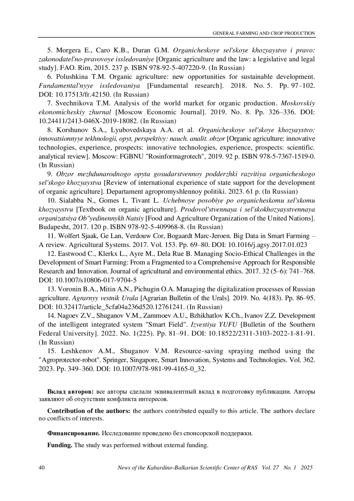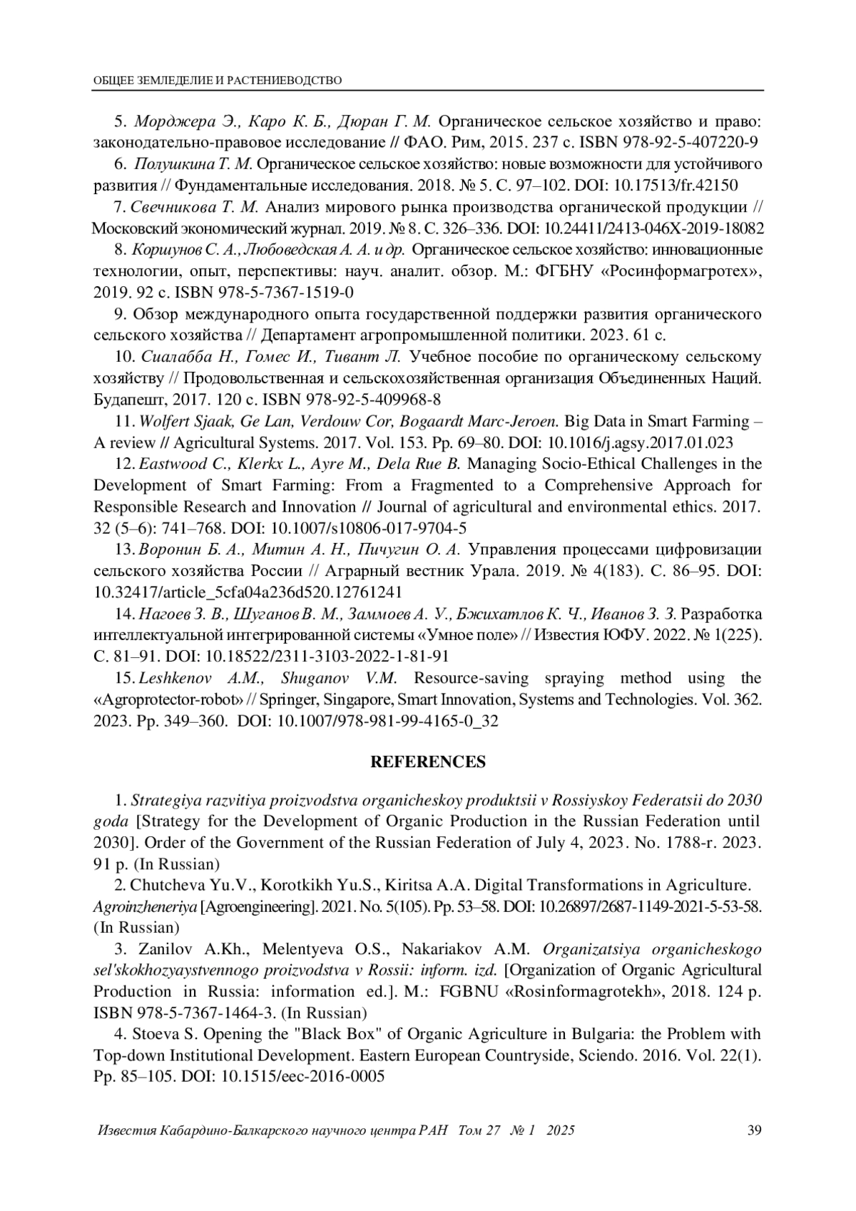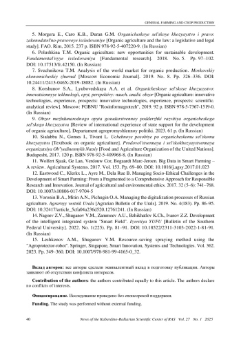 8. Коршунов С. А., Любоведская А. А. и др. Органическое сельское хозяйство: инновационные технологии, опыт, перспективы: науч. аналит. обзор. М.: ФГБНУ “Росинформагротех”, 2019. 92 с. ISBN: 978-5-7367-1519-0 EDN: ZPVYYH
