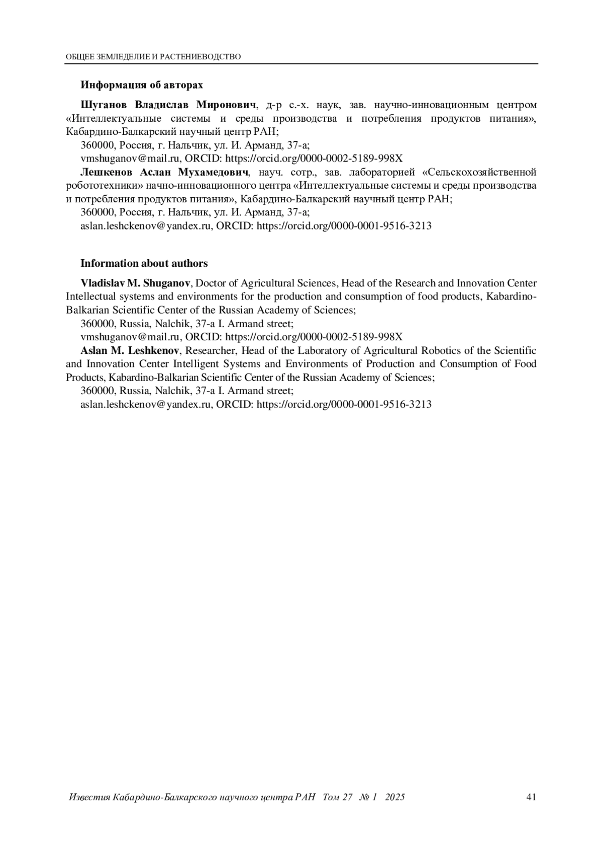 16. Leshkenov А.М., Shuganov V.M. Resource-saving spraying method using the “Agroprotector-robot” // Springer, Singapore, Smart Innovation, Systems and Technologies. Vol. 362. 2023. Pp. 349-360. DOI: 10.1007/978-981-99-4165-0_32