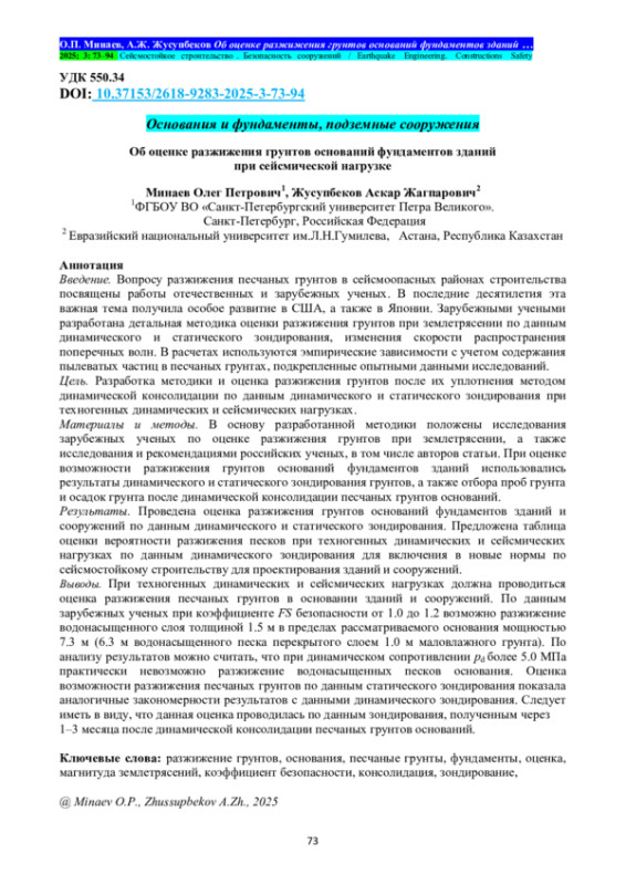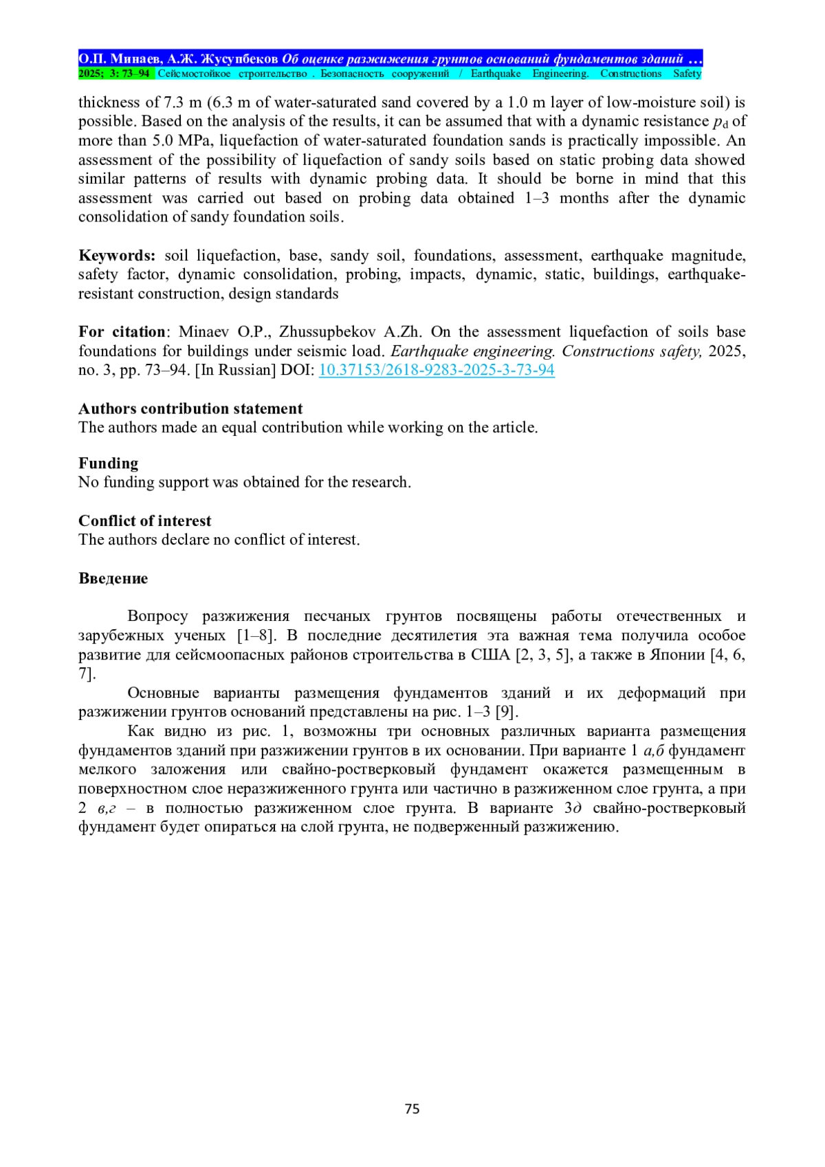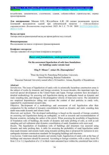 Введение. Вопросу разжижения песчаных грунтов в сейсмоопасных районах строительства посвящены работы отечественных и зарубежных ученых. В последние десятилетия эта важная тема получила особое развитие в США, а также в Японии. Зарубежными учеными разработана детальная методика оценки разжижения грунтов при землетрясении по данным динамического и статического зондирования, изменения скорости распространения поперечных волн. В расчетах используются эмпирические зависимости с учетом содержания пылеватых частиц в песчаных грунтах, подкрепленные опытными данными исследований.
