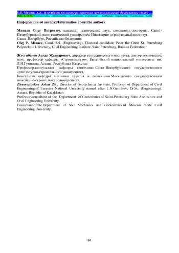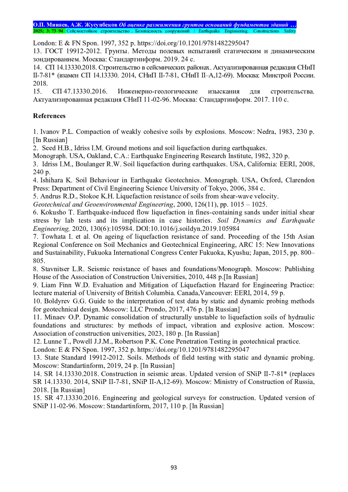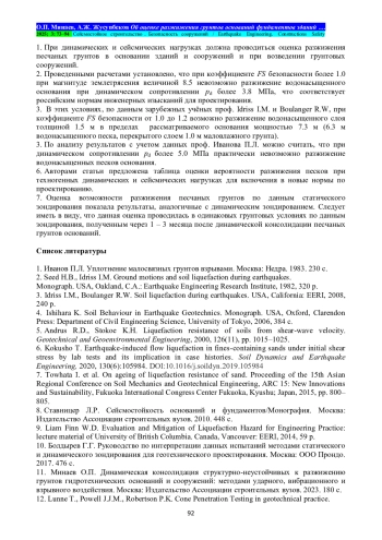 Выводы. При техногенных динамических и сейсмических нагрузках должна проводиться оценка разжижения песчаных грунтов в основании зданий и сооружений. По данным зарубежных ученых при коэффициенте FS безопасности от 1.0 до 1.2 возможно разжижение водонасыщенного слоя толщиной 1.5 м в пределах рассматриваемого основания мощностью 7.3 м (6.3 м водонасыщенного песка перекрытого слоем 1.0 м маловлажного грунта). По анализу результатов можно считать, что при динамическом сопротивлении рd более 5.0 МПа практически невозможно разжижение водонасыщенных песков основания. Оценка возможности разжижения песчаных грунтов по данным статического зондирования показала аналогичные закономерности результатов с данными динамического зондирования. Следует иметь в виду, что данная оценка проводилась по данным зондирования, полученным через 1–3 месяца после динамической консолидации песчаных грунтов оснований.