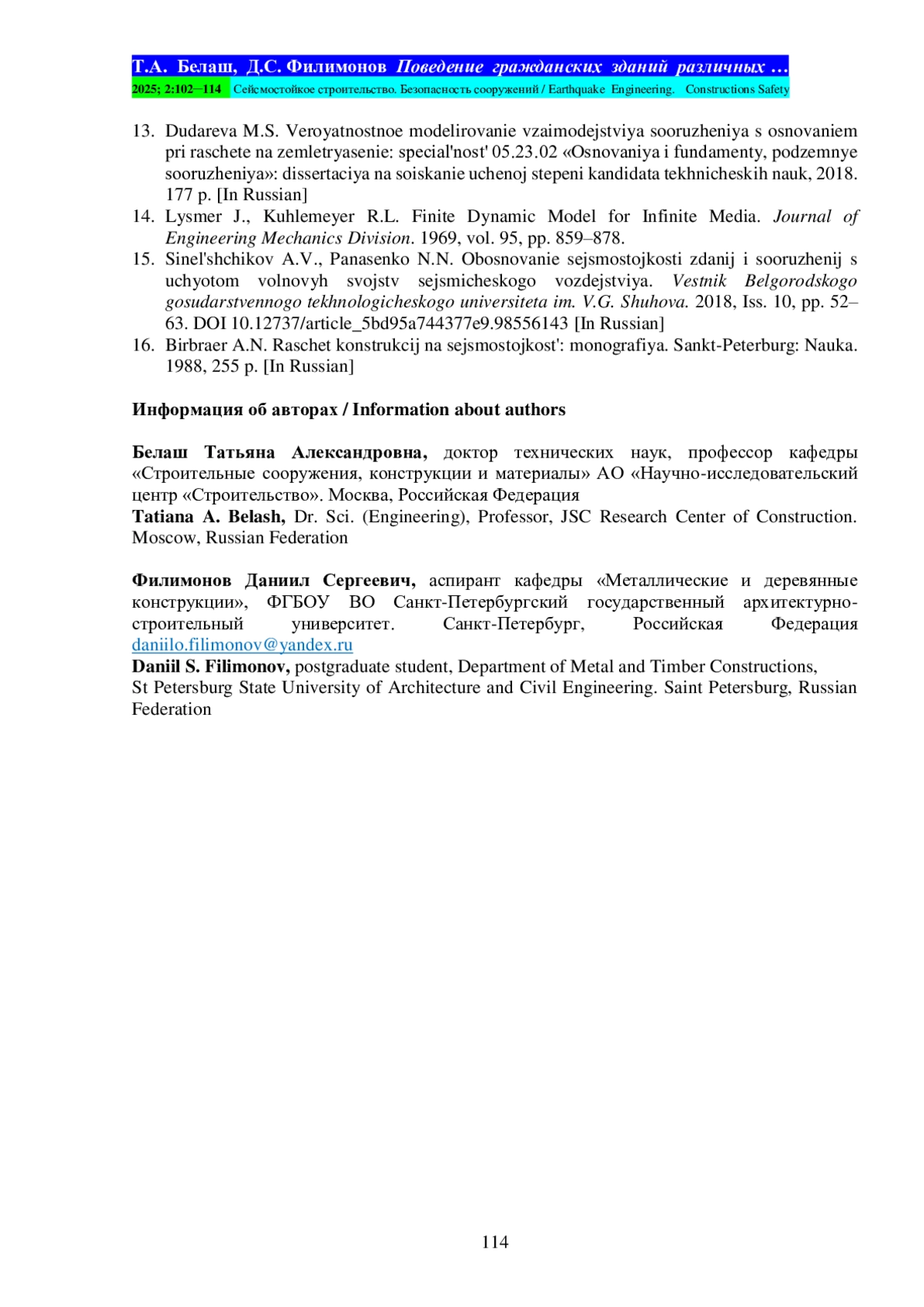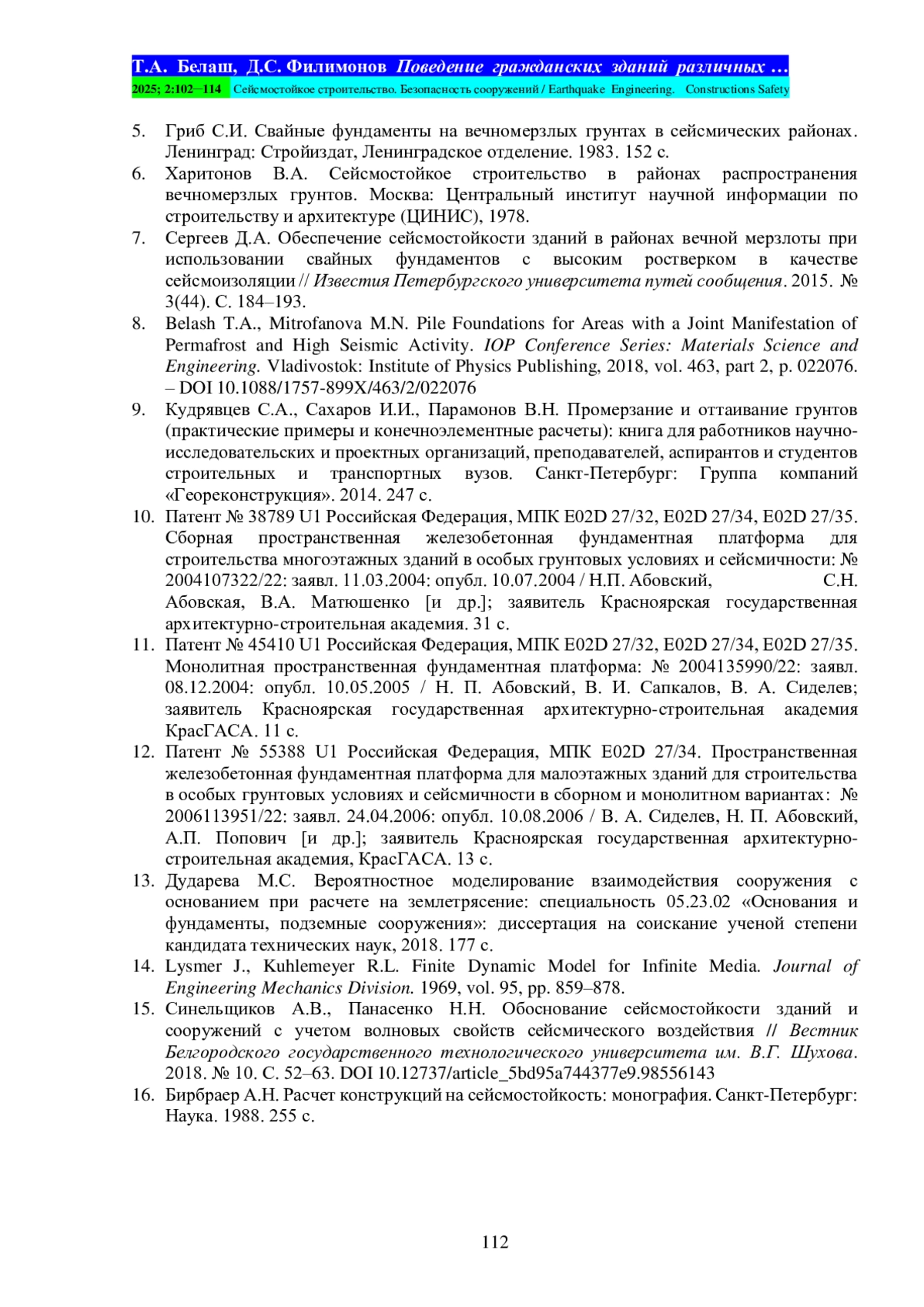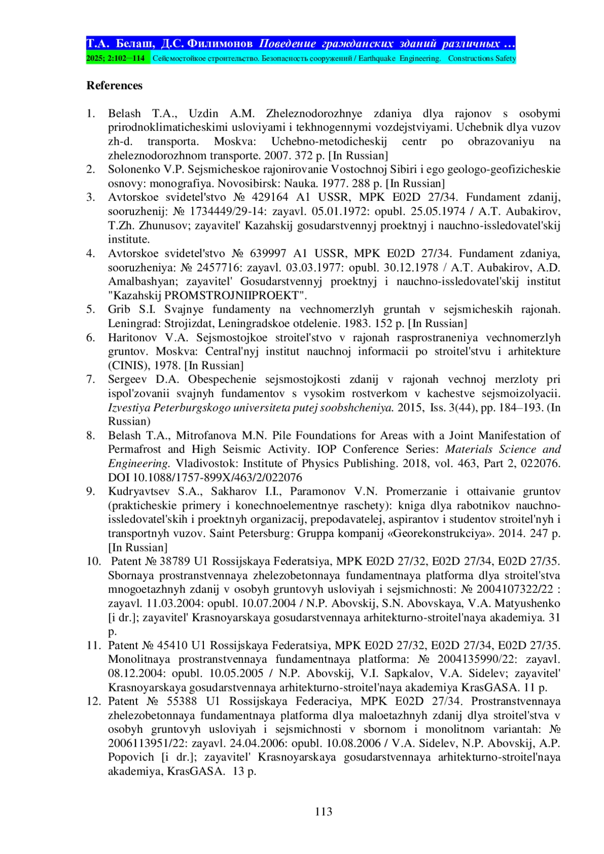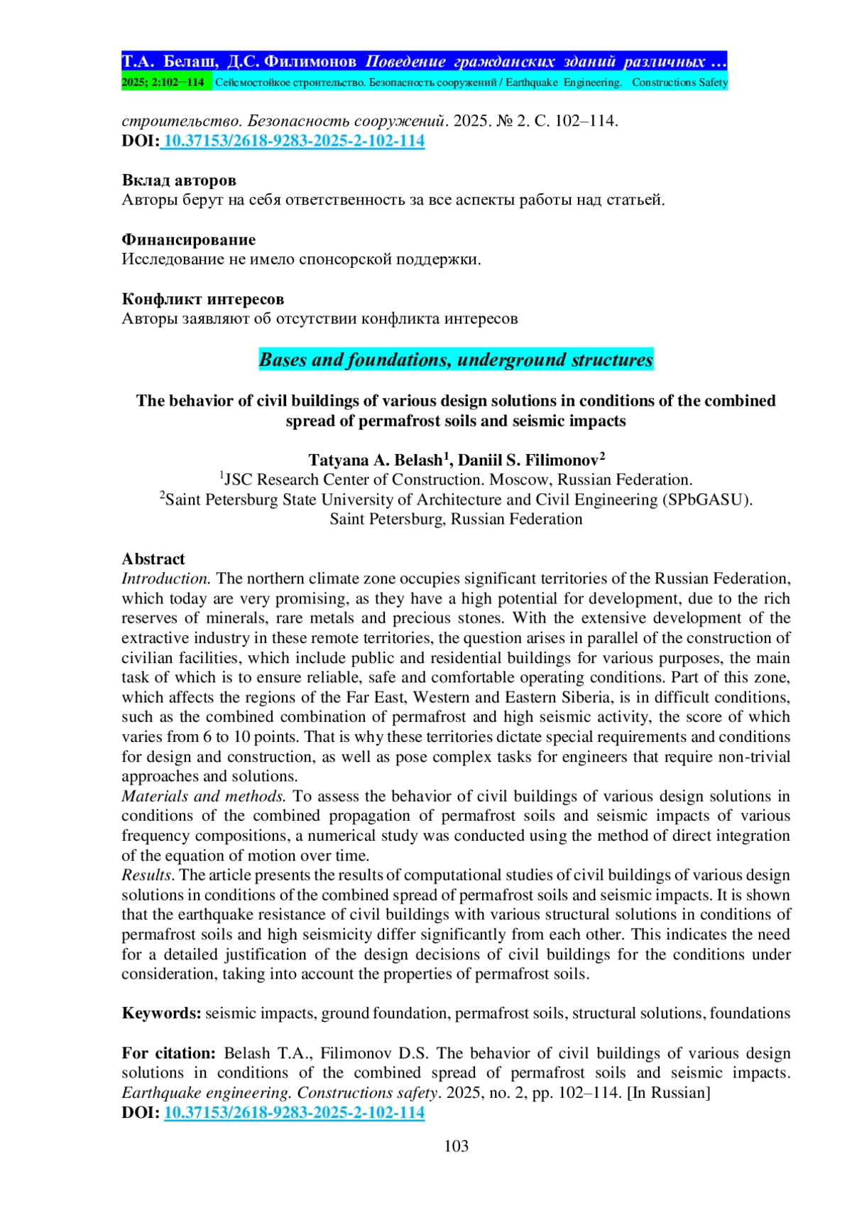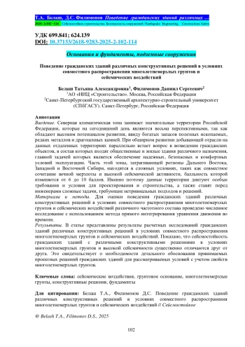 БЕЛАШ Т. А., ФИЛИМОНОВ Д. С. ПОВЕДЕНИЕ ГРАЖДАНСКИХ ЗДАНИЙ РАЗЛИЧНЫХ КОНСТРУКТИВНЫХ РЕШЕНИЙ В УСЛОВИЯХ СОВМЕСТНОГО РАСПРОСТРАНЕНИЯ МНОГОЛЕТНЕМЕРЗЛЫХ ГРУНТОВ И СЕЙСМИЧЕСКИХ ВОЗДЕЙСТВИЙ // СЕЙСМОСТОЙКОЕ СТРОИТЕЛЬСТВО. БЕЗОПАСНОСТЬ СООРУЖЕНИЙ. 2025. № 2
