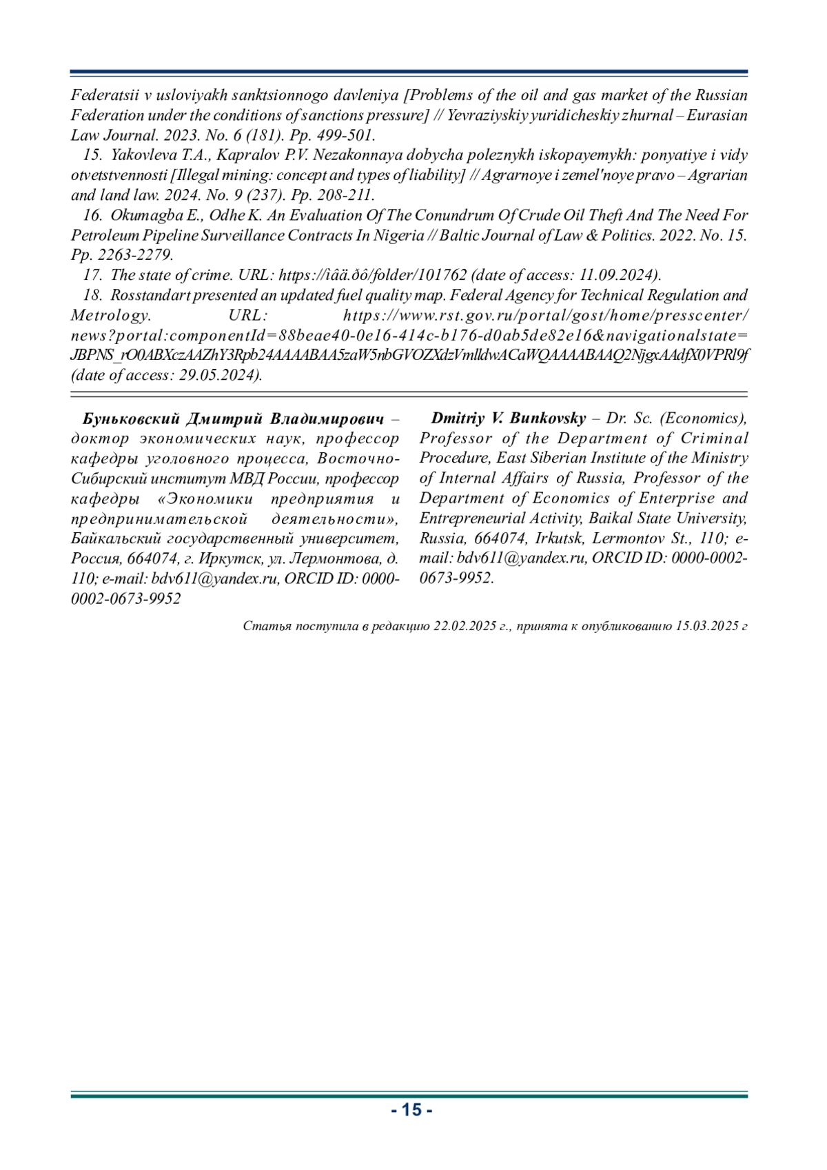 16. Okumagba E., Odhe K. An Evaluation Of The Conundrum Of Crude Oil Theft And The Need For Petroleum Pipeline Surveillance Contracts In Nigeria // Baltic Journal of Law & Politics. 2022. № 15. pp. 2263-2279.