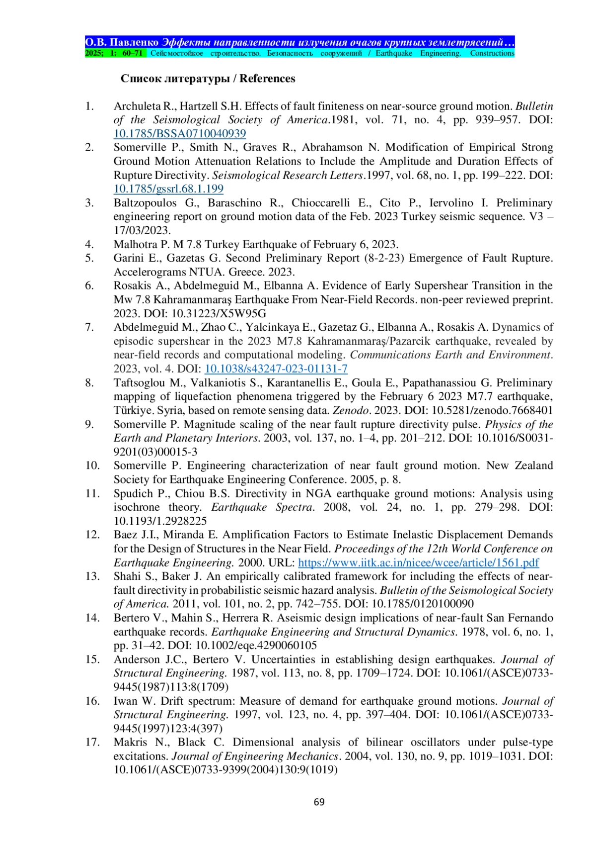 9. Somerville P. Magnitude scaling of the near fault rupture directivity pulse. Physics of the Earth and Planetary Interiors. 2003, vol. 137, no. 1-4, pp. 201-212. DOI: 10.1016/S0031-9201(03)00015-3