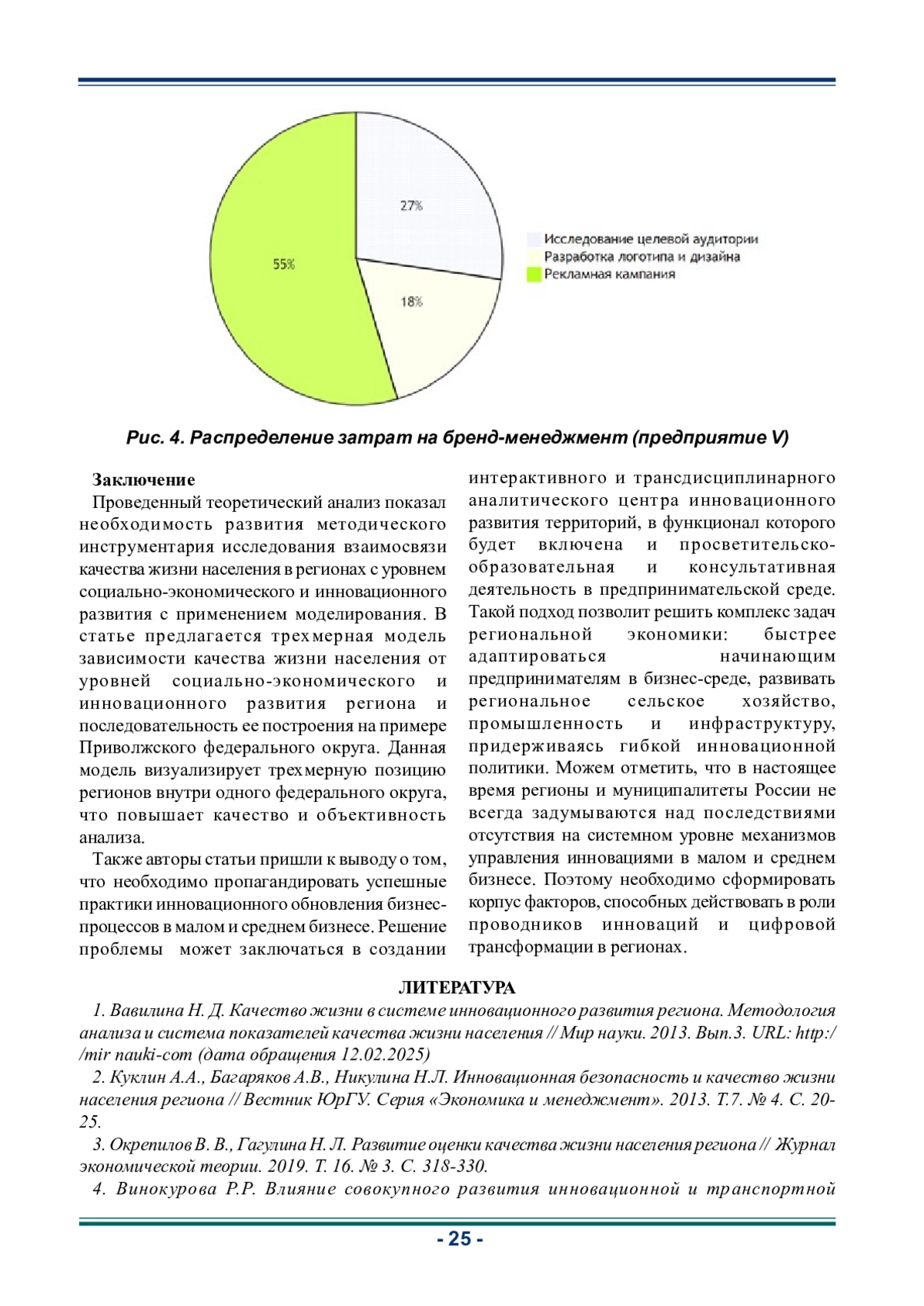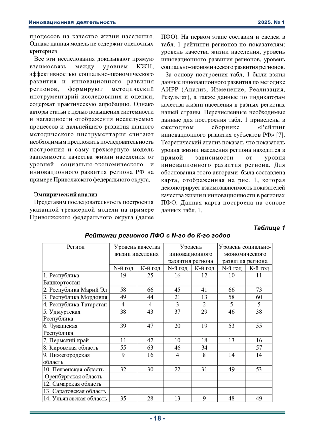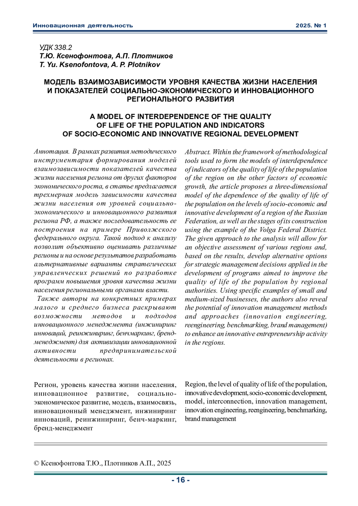 В рамках развития методического инструментария формирования моделей взаимозависимости показателей качества жизни населения региона от других факторов экономического роста, в статье предлагается трехмерная модель зависимости качества жизни населения от уровней социально- экономического и инновационного развития региона РФ, а также последовательность ее построения на примере Приволжского федерального округа. Такой подход к анализу позволит объективно оценивать различные регионы и на основе результатов разработать альтернативные варианты стратегических управленческих решений по разработке программ повышения уровня качества жизни населения региональными органами власти. Также авторы на конкретных примерах малого и среднего бизнеса раскрывают возможности методов и подходов инновационного менеджмента (инжиниринг инноваций, реинжиниринг, бенчмаркинг, бренд- менеджмент) для активизации инновационной активности предпринимательской деятельности в регионах.