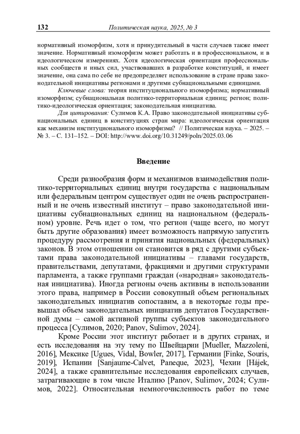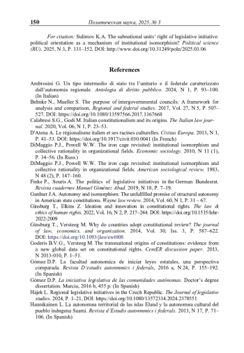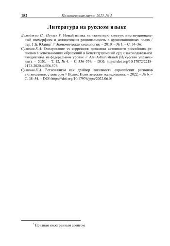 3. Сулимов К.А. Регионализм как драйвер активности европейских регионов в отношениях с центром // Полис. Политические исследования. - 2022. - № 6. - С. 38-54. - https://doi.org/10.17976/jpps/2022.06.04