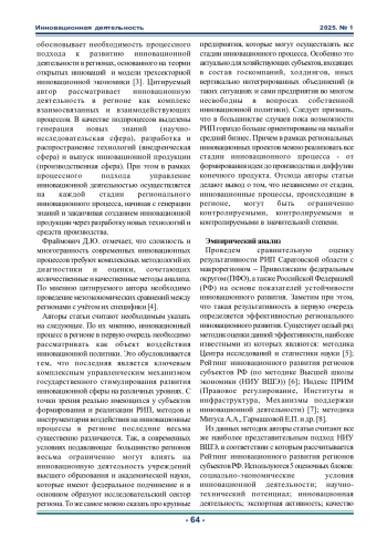 В статье дана характеристика особенностей регионального инновационного процесса, как объекта воздействия инновационной политики. Данные особенности заключаются в разной возможности субъектов формирования и реализации региональной инновационной политики влиять на те или иные инновационные процессы, протекающих частично, или полностью, на соответствующей территории. Сделан вывод о том, что независимо от стадии инновационные процессы, происходящие в регионе, с точки зрения инновационной политики могут быть ограниченно контролируемыми, контролируемыми и контролируемыми в значительной степени. Предложены рекомендации по совершенствованию оценки качества региональной инновационной политики за счет введения параметра информационно- аналитического обеспечения, отражающего степень доступности и полноты информации о региональном инновационном процессе и соответствующих аналитических наработок на Интернет-ресурсах.