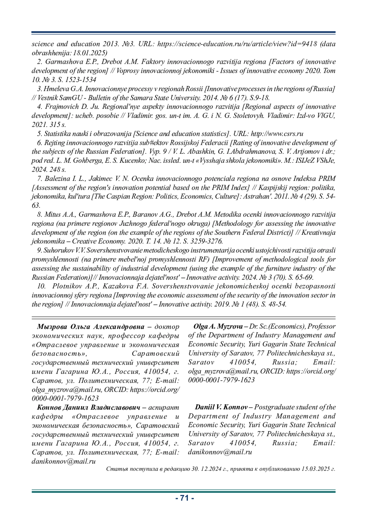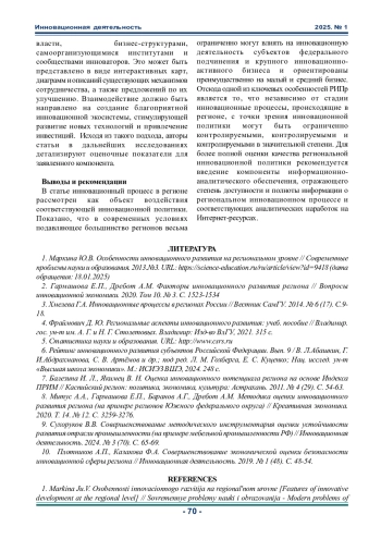 2. Гармашова Е.П., Дребот А.М. Факторы инновационного развития региона // Вопросы инновационной экономики. 2020. Том 10. № 3. С. 1523-1534. EDN: ROXAMF