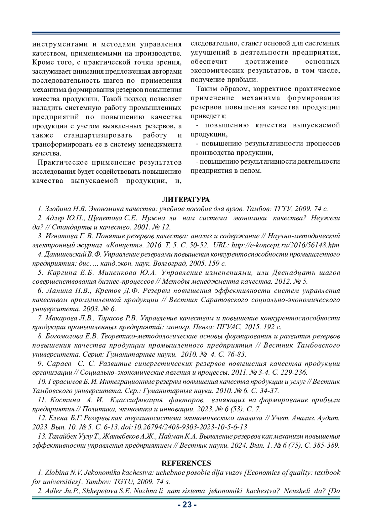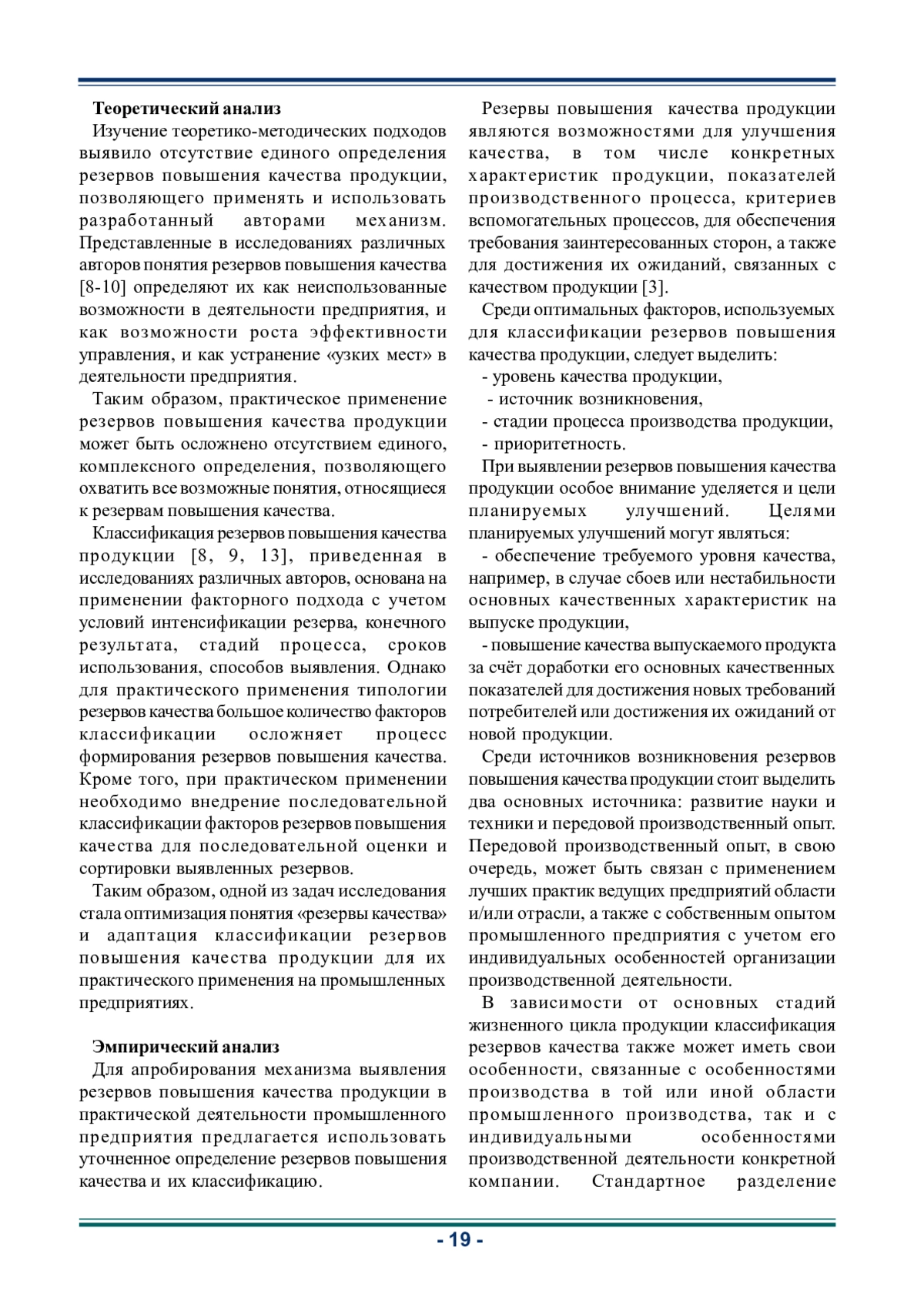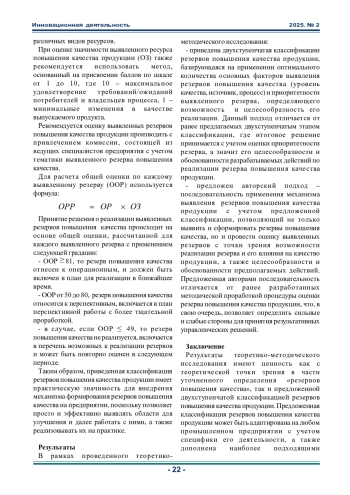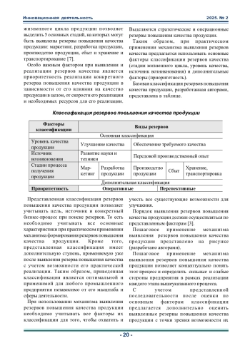 Статья: КЛАССИФИКАЦИЯ РЕЗЕРВОВ ПОВЫШЕНИЯ КАЧЕСТВА ПРОДУКЦИИ И ТЕОРЕТИКО-МЕТОДИЧЕСКИЙ ПОДХОД К ИХ ОЦЕНКЕ (2025)