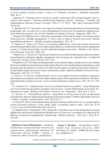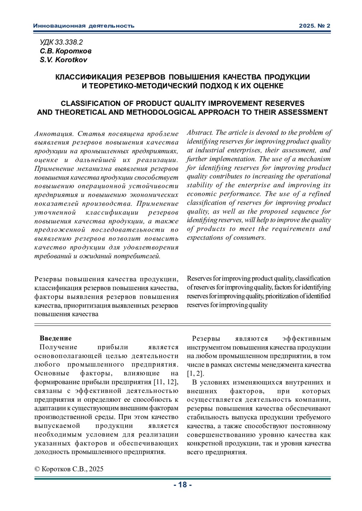 КОРОТКОВ С. В. КЛАССИФИКАЦИЯ РЕЗЕРВОВ ПОВЫШЕНИЯ КАЧЕСТВА ПРОДУКЦИИ И ТЕОРЕТИКО-МЕТОДИЧЕСКИЙ ПОДХОД К ИХ ОЦЕНКЕ // ИННОВАЦИОННАЯ ДЕЯТЕЛЬНОСТЬ. 2025. № 2 (73)