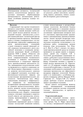 Статья посвящена анализу инновационной составляющей устойчивого развития системы «человек-производство». Актуальность исследования определяется значимостью инновационной активности в контексте устойчивого развития для производства и работников, заключающейся в повышении конкурентоспособности хозяйствующих субъектов, формировании сбалансированной модели развития, создании новых рабочих мест, преодолении экономических трудностей. В ходе теоретического анализа рассмотрена структура системы «человек-производство», которая включает человеческий капитал, производственные процессы, технологическую структуру, организационные механизмы, экологические параметры. Рассмотрены экономическая, социальная, экологическая и инновационная составляющие концепции устойчивого развития, оказывающей влияние на развитие отношений «человек-производство». Проанализирован уровень инновационной активности российских организаций, инновационная активность и доля продуктовых и процессных инноваций организаций обрабатывающей промышленности, уровень автоматизации российских отраслей промышленности, использование цифровых технологий и индекс экоинвестиций в обрабатывающей отрасли.