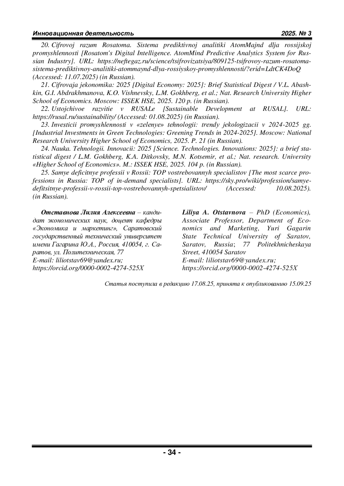12. Янченко Е.В. Цифровые инновации в решении вопросов устойчивого природопользования и энергосбережения // Инновационная деятельность. 2025. № 2 (73). С. 25-35.