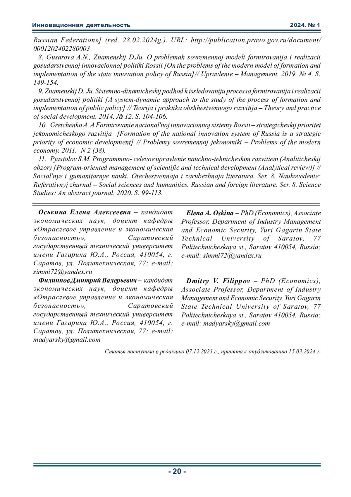 ОСЬКИНА Е. А., ФИЛИППОВ Д. В. МОДЕЛЬ ГОСУДАРСТВЕННОЙ ИННОВАЦИОННОЙ ПОЛИТИКИ РОССИИ // ИННОВАЦИОННАЯ ДЕЯТЕЛЬНОСТЬ. 2024. № 1 (68)
