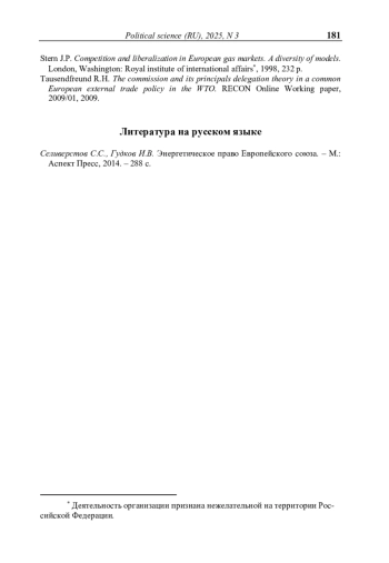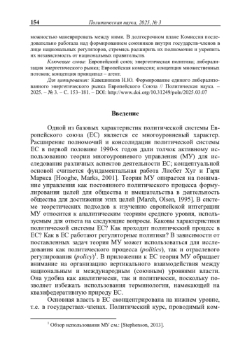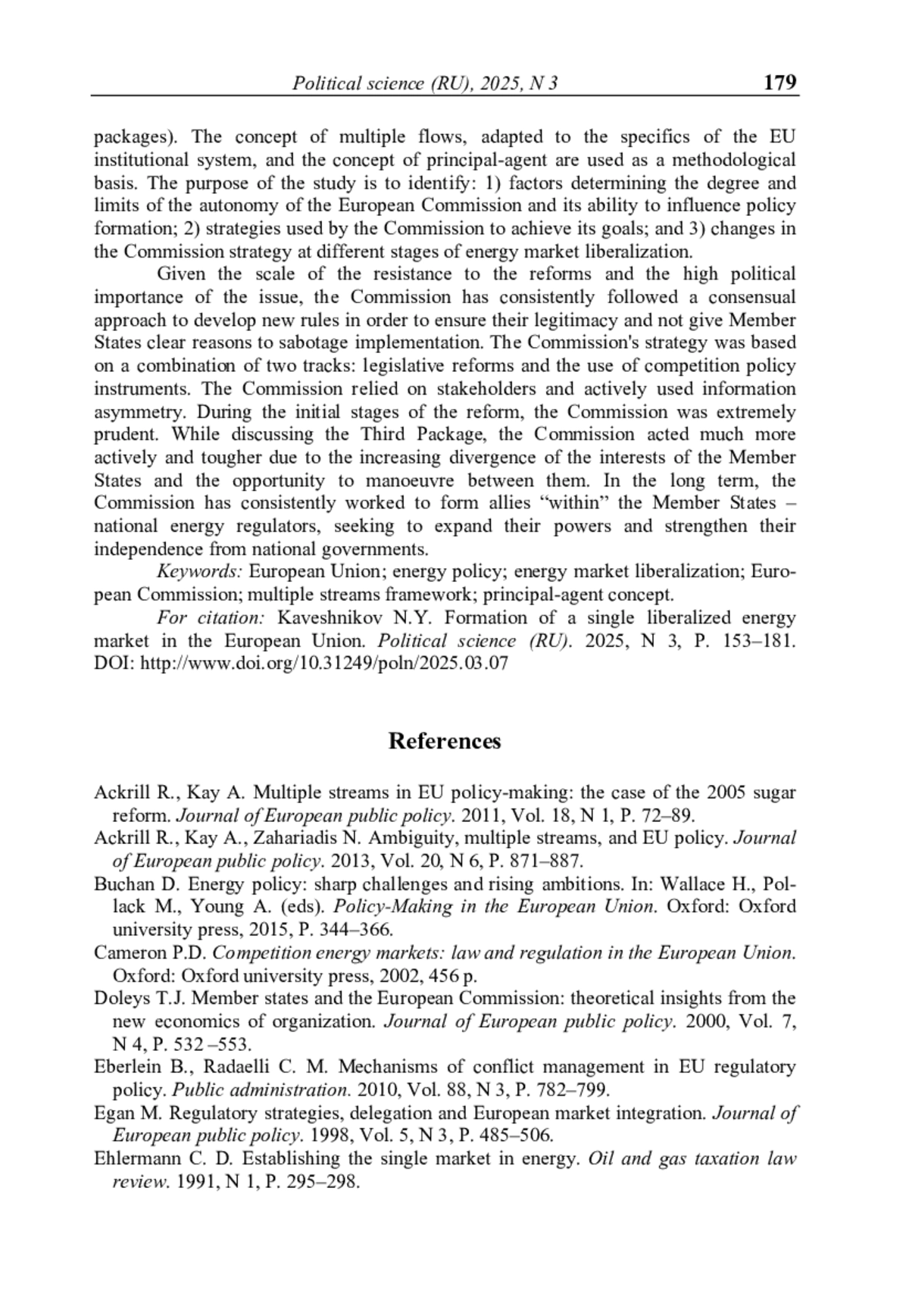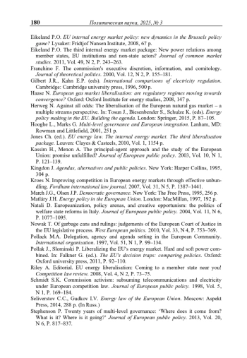 КАВЕШНИКОВ Н. Ю. ФОРМИРОВАНИЕ ЕДИНОГО ЛИБЕРАЛИЗОВАННОГО ЭНЕРГЕТИЧЕСКОГО РЫНКА ЕВРОПЕЙСКОГО СОЮЗА // ПОЛИТИЧЕСКАЯ НАУКА. 2025. №3