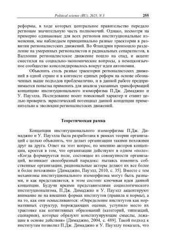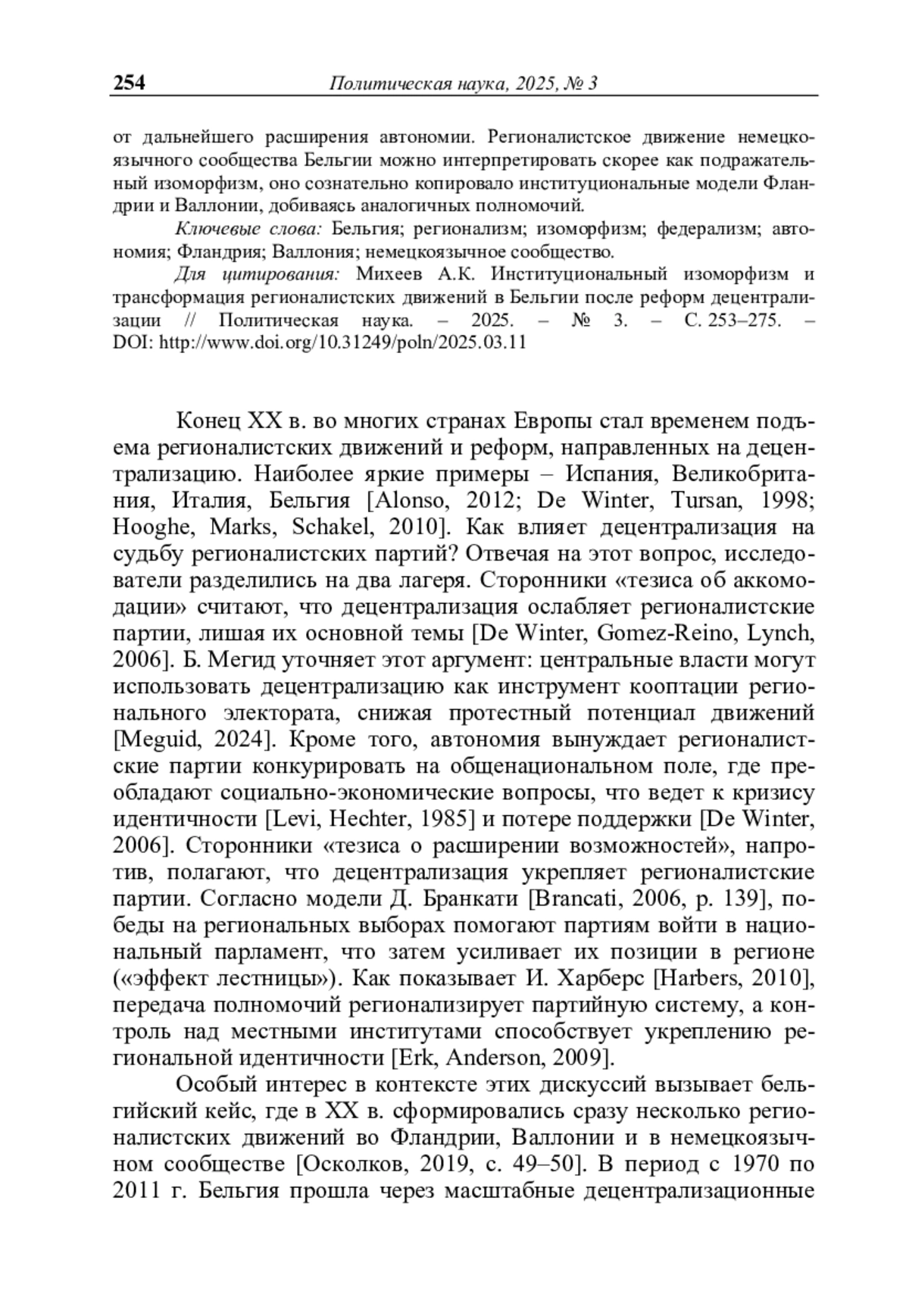 МИХЕЕВ А. К. ИНСТИТУЦИОНАЛЬНЫЙ ИЗОМОРФИЗМ И ТРАНСФОРМАЦИЯ РЕГИОНАЛИСТСКИХ ДВИЖЕНИЙ В БЕЛЬГИИ ПОСЛЕ РЕФОРМ ДЕЦЕНТРАЛИЗАЦИИ // ПОЛИТИЧЕСКАЯ НАУКА. 2025. №3