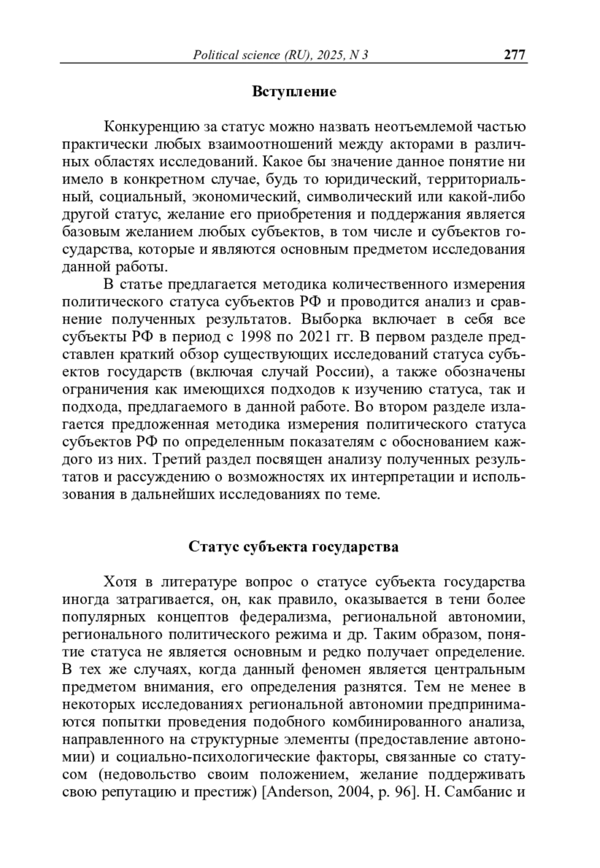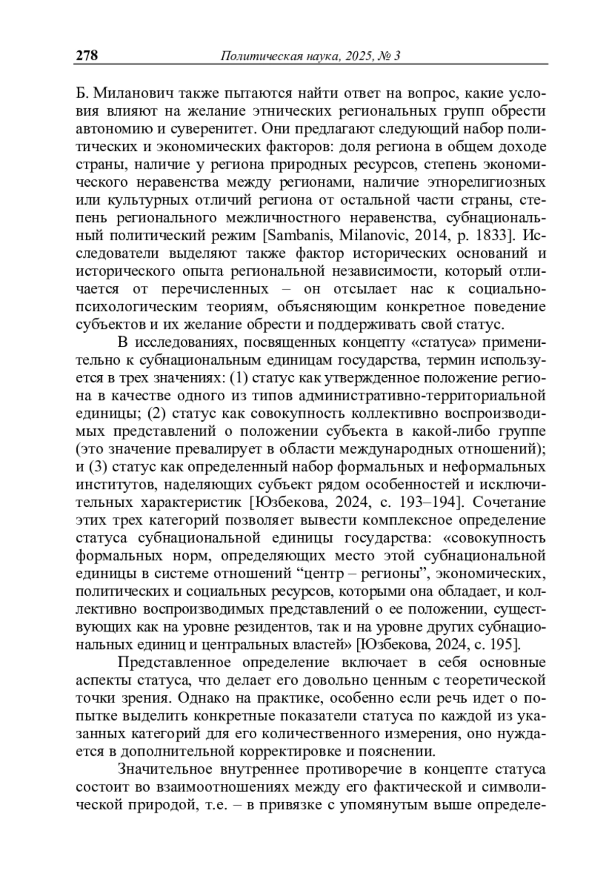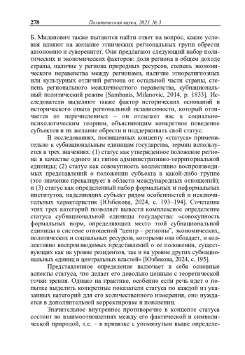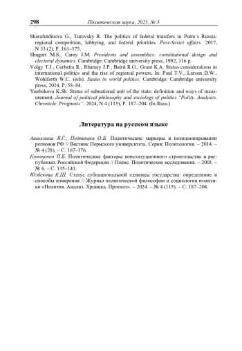 ЮЗБЕКОВА К. Ш. ТРАНСФОРМАЦИЯ ПОЛИТИЧЕСКОГО СТАТУСА СУБЪЕКТОВ РОССИЙСКОЙ ФЕДЕРАЦИИ В УСЛОВИЯХ ЦЕНТРАЛИЗАЦИИ // ПОЛИТИЧЕСКАЯ НАУКА. 2025. №3