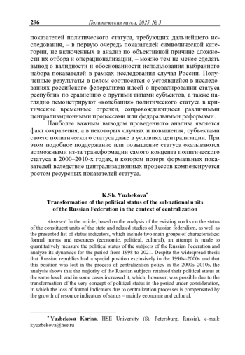 В статье на основе анализа существующих работ на тему статуса субъекта государства и смежных с ней исследований российского федерализма, а также представленного списка показателей статуса, которые включают в себя две основные группы характеристик: формальные нормы и ресурсы (экономические, политические, культурные), предпринимается попытка количественно измерить политический статус субъектов РФ и проанализировать его динамику за период с 1998 по 2021 гг. Несмотря на распространенный тезис о наличии особого положения исключительно у российских республик в 1990–2000-х гг. и о потере данного положения в процессе политики централизации 2000–2010-х гг., проведенный анализ демонстрирует сохранение большинством субъектов РФ своего политического статуса на прежнем уровне, а в некоторых случаях – его повышение, что, однако, оказывается возможным из-за трансформации самого концепта политического статуса в рассматриваемый период, в котором потеря формальных показателей вследствие централизационных процессов компенсируется ростом ресурсных показателей статуса – в первую очередь экономических и культурных.