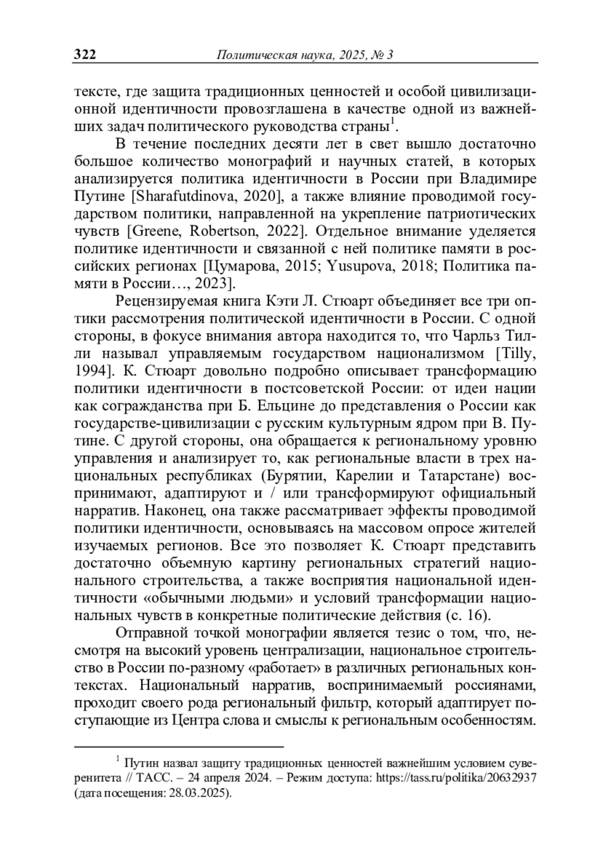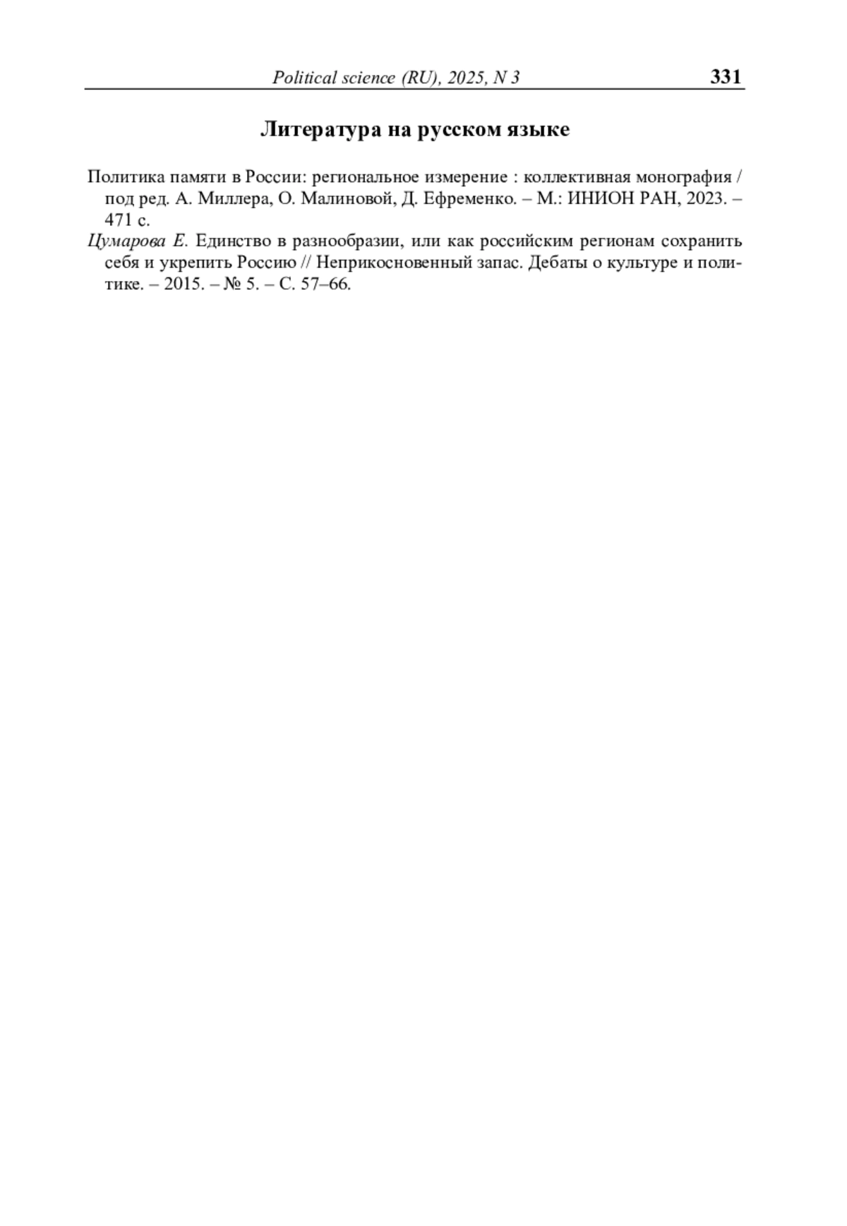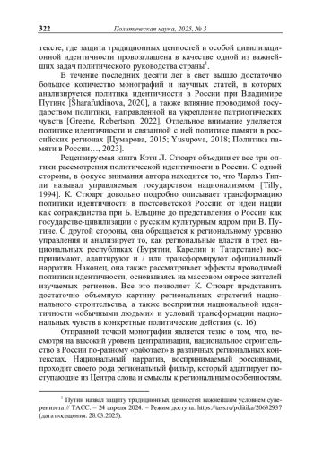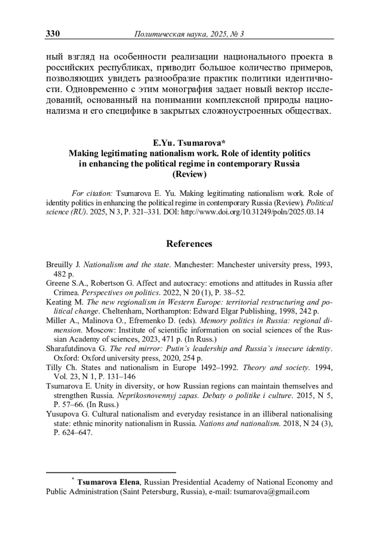 ЦУМАРОВА Е. Ю. ЧТОБЫ ЛЕГИТИМИРУЮЩИЙ НАЦИОНАЛИЗМ СРАБОТАЛ: РОЛЬ ПОЛИТИКИ ИДЕНТИЧНОСТИ В УКРЕПЛЕНИИ ПОЛИТИЧЕСКОГО РЕЖИМА В СОВРЕМЕННОЙ РОССИИ (РЕЦЕНЗИЯ) // ПОЛИТИЧЕСКАЯ НАУКА. 2025. №3