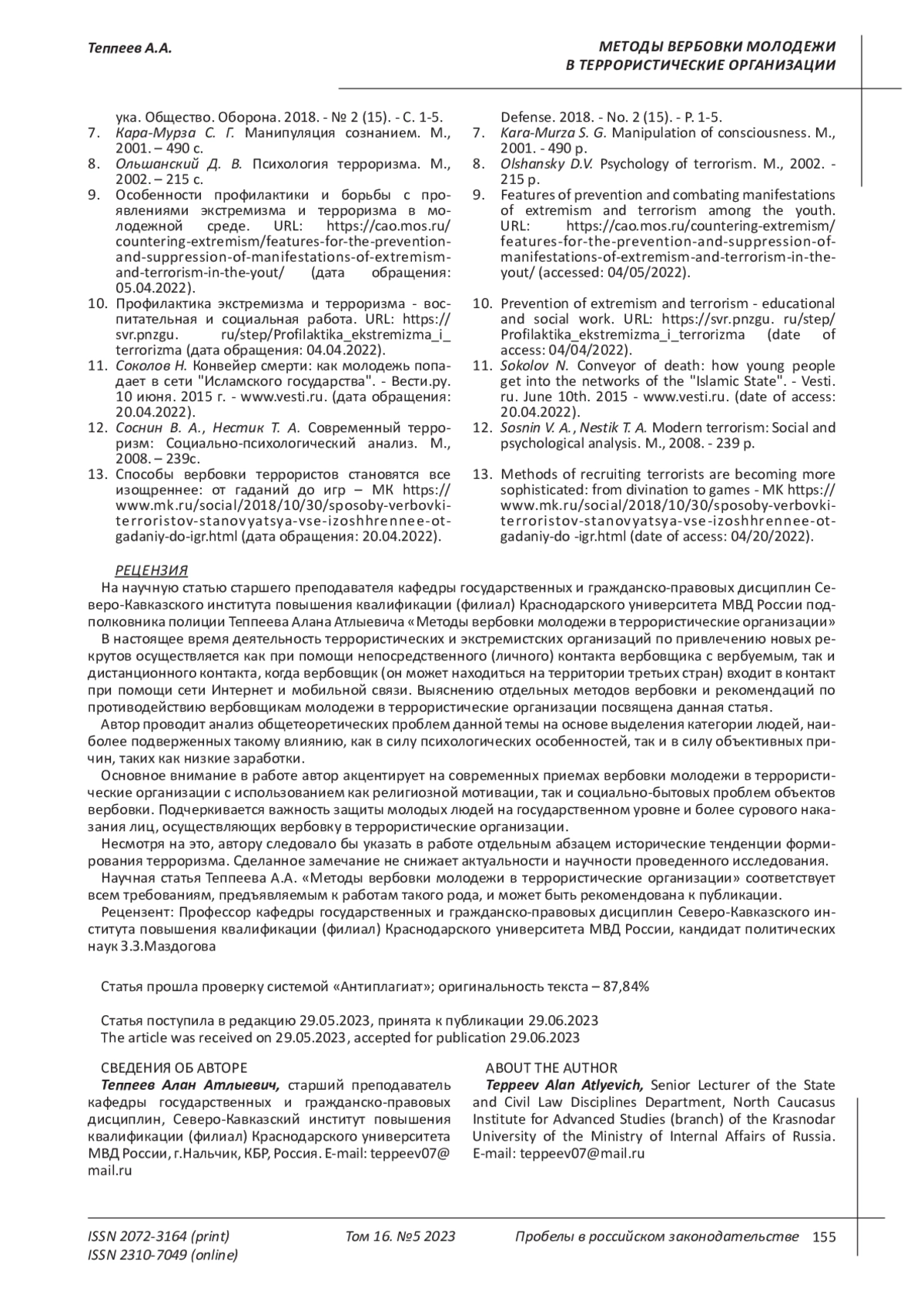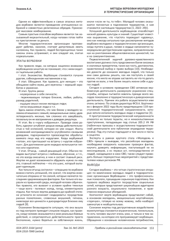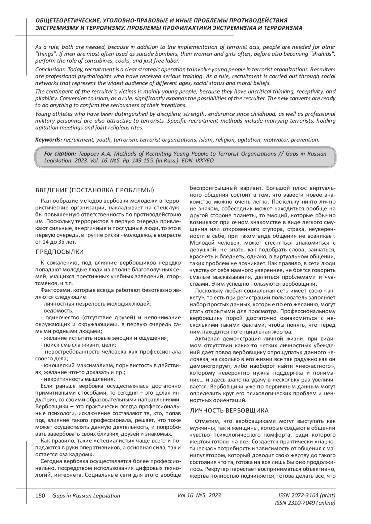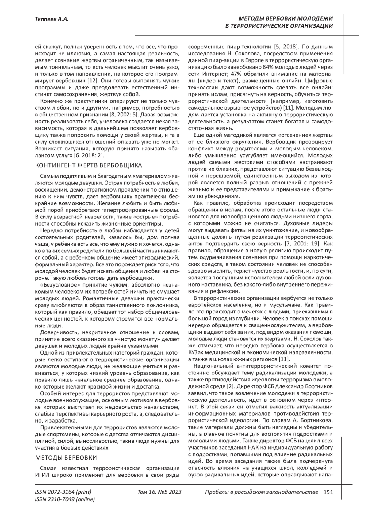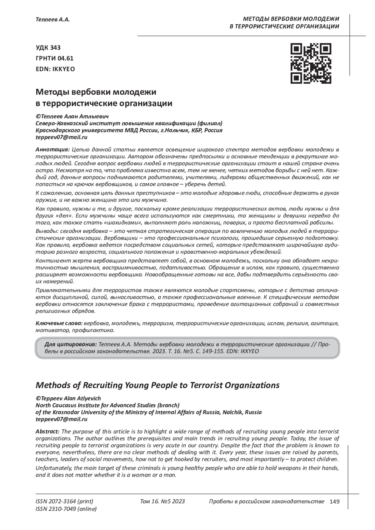ТЕППЕЕВ А. А. МЕТОДЫ ВЕРБОВКИ МОЛОДЕЖИ В ТЕРРОРИСТИЧЕСКИЕ ОРГАНИЗАЦИИ // ПРОБЕЛЫ В РОССИЙСКОМ ЗАКОНОДАТЕЛЬСТВЕ. 2023. Т. 16 № 5
