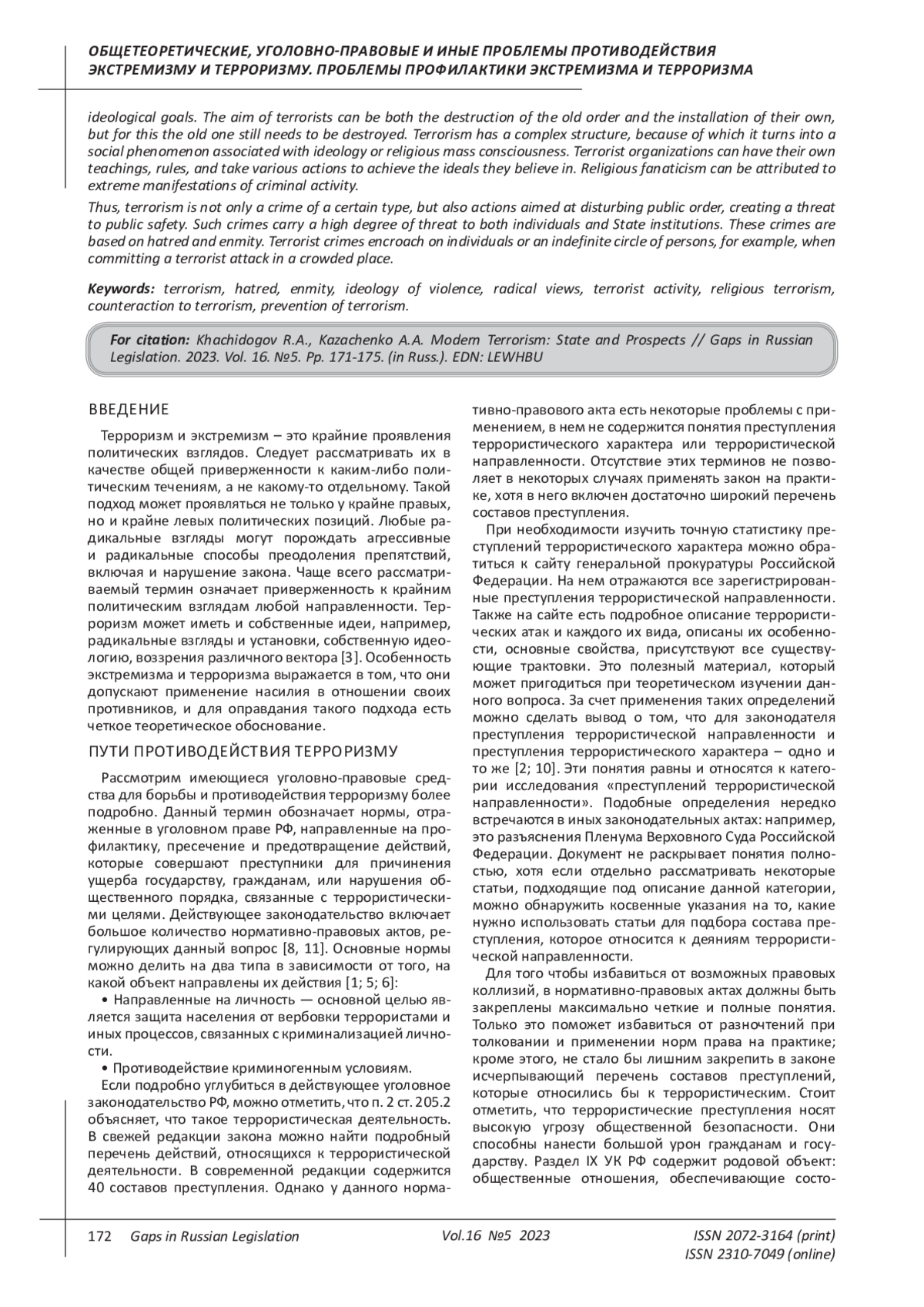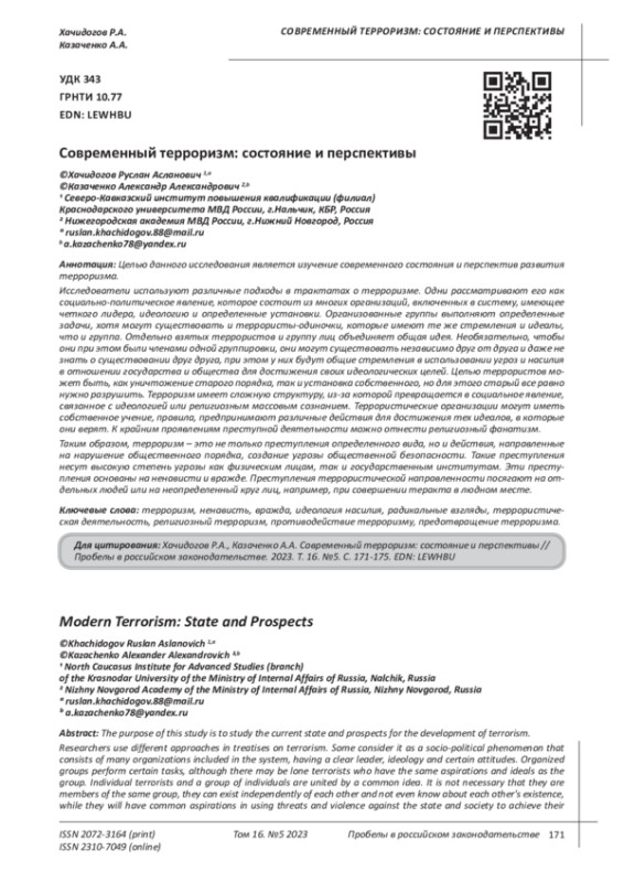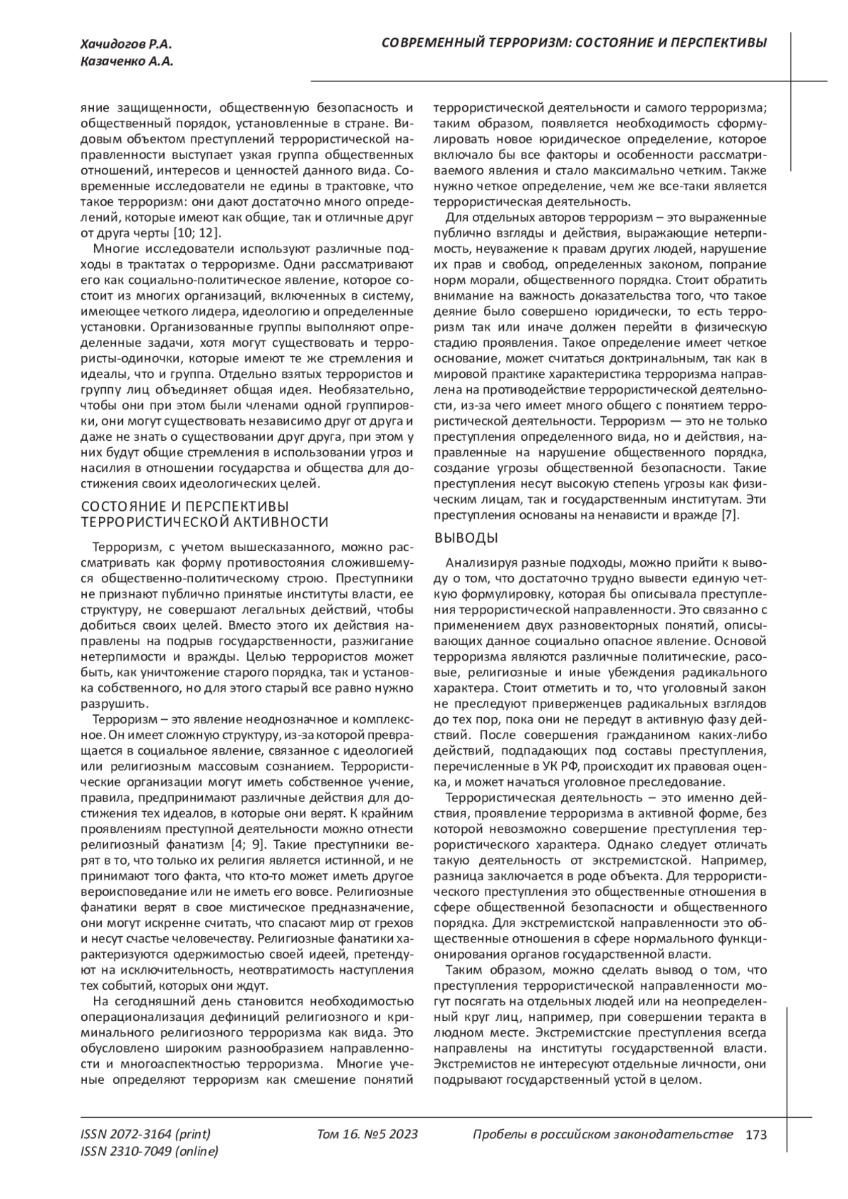 ХАЧИДОГОВ Р. А., КАЗАЧЕНКО А. А. СОВРЕМЕННЫЙ ТЕРРОРИЗМ: СОСТОЯНИЕ И ПЕРСПЕКТИВЫ // ПРОБЕЛЫ В РОССИЙСКОМ ЗАКОНОДАТЕЛЬСТВЕ. 2023. Т. 16 № 5