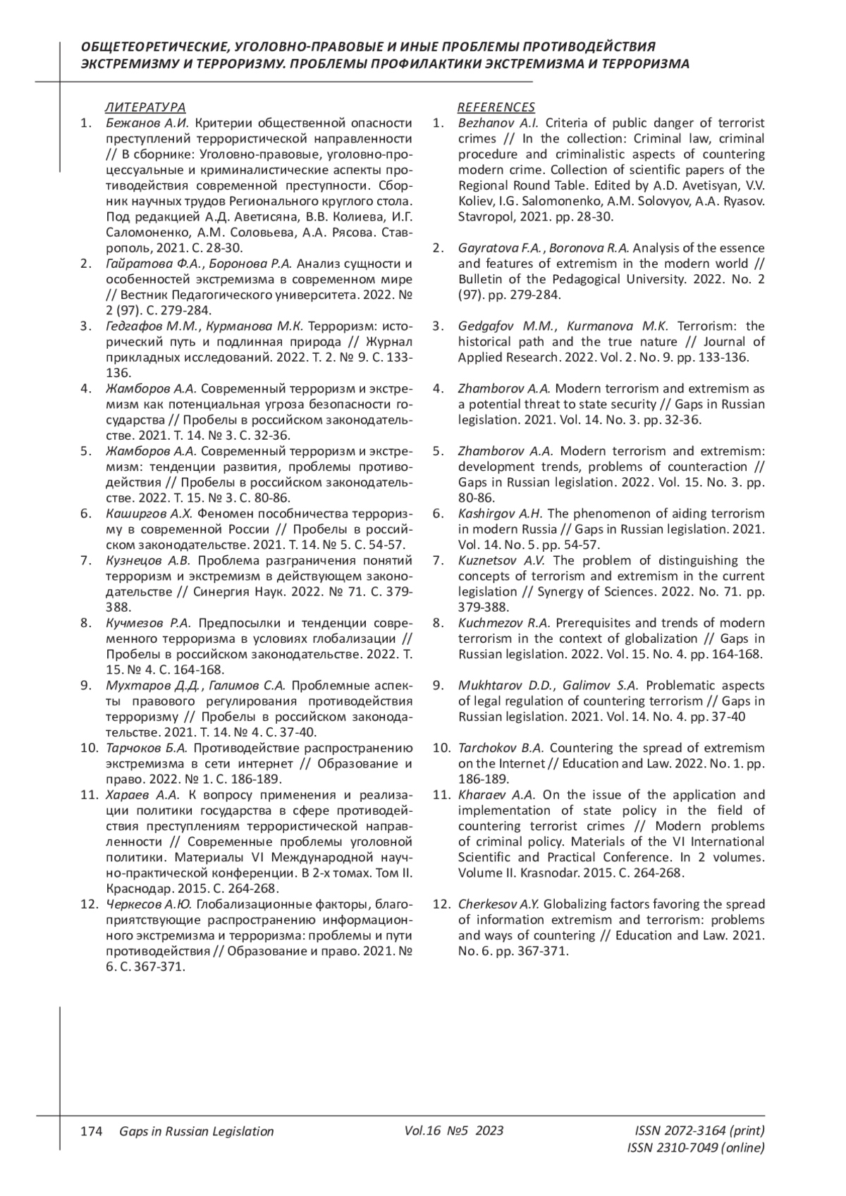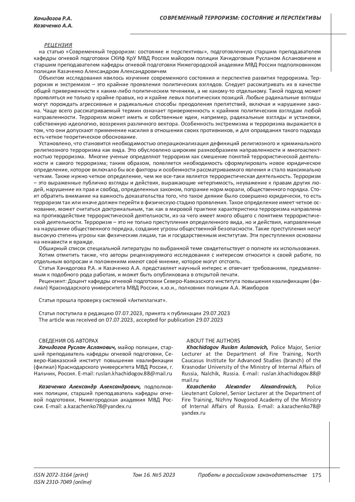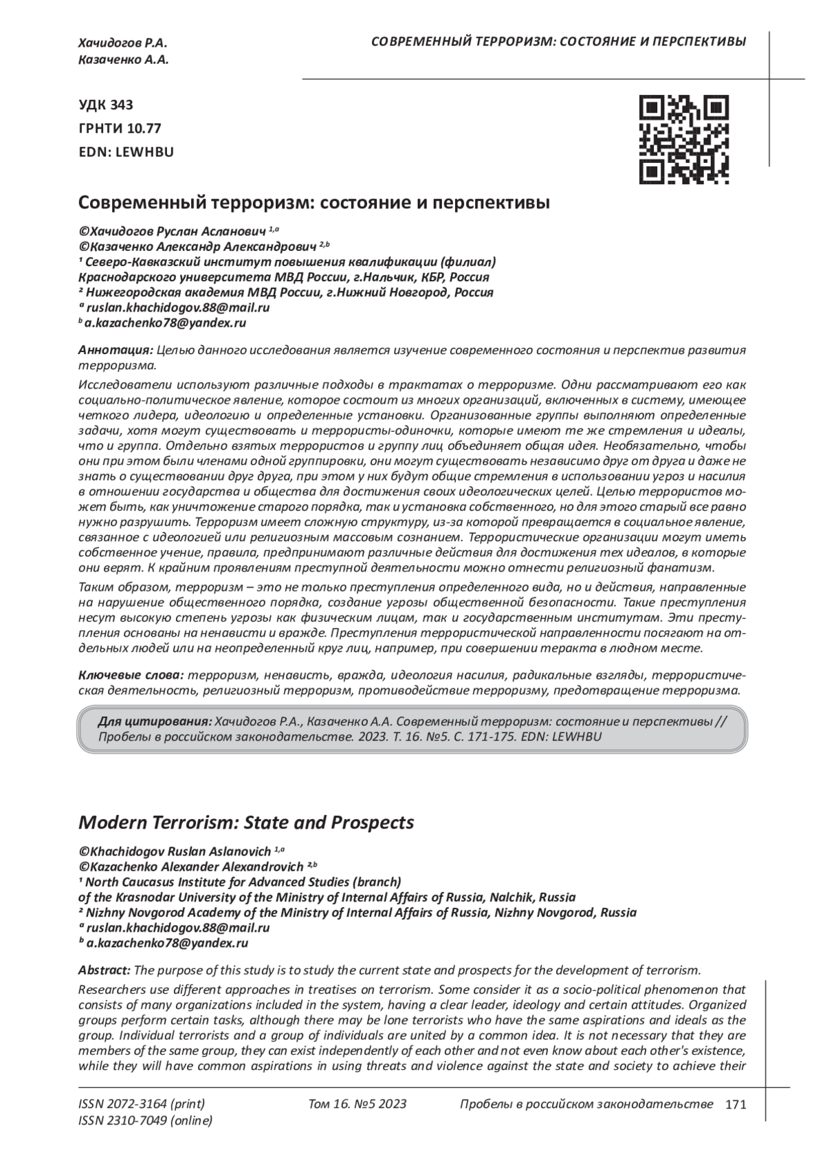 ХАЧИДОГОВ Р. А., КАЗАЧЕНКО А. А. СОВРЕМЕННЫЙ ТЕРРОРИЗМ: СОСТОЯНИЕ И ПЕРСПЕКТИВЫ // ПРОБЕЛЫ В РОССИЙСКОМ ЗАКОНОДАТЕЛЬСТВЕ. 2023. Т. 16 № 5