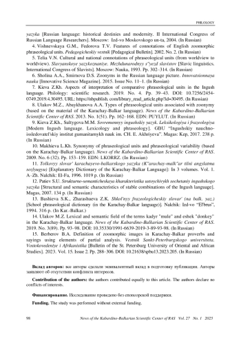 15. Берберов Б. А. Определение зооморфных образов в карачаево-балкарских пословицах и поговорках с использованием элементов частичного анализа // Вестник Санкт-Петербургского университета. Востоковедение и Африканистика. 2023. Т. 15. Вып. 2. С. 288-306. DOI: 10.21638/spbu13.2023.205 EDN: UIMTFT