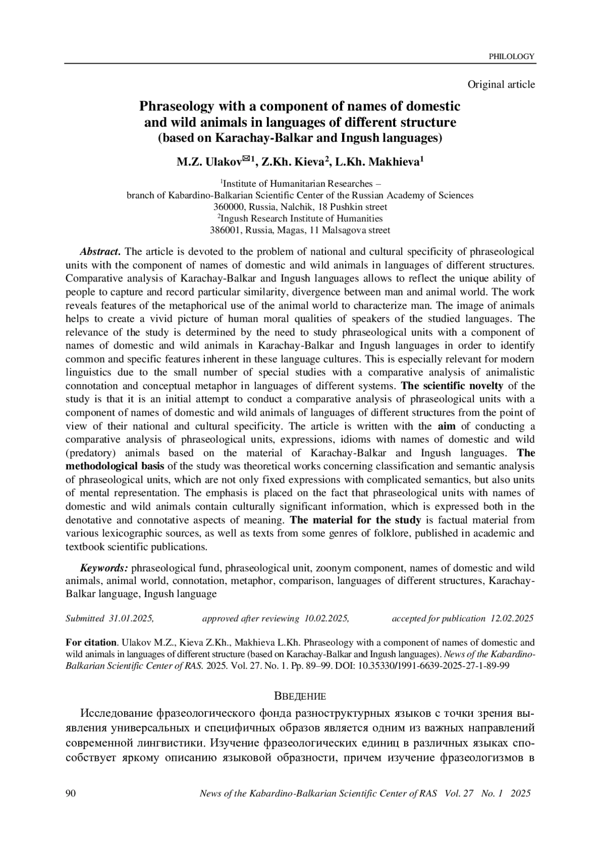 Статья посвящена проблеме национально-культурной специфики фразеологизмов с компонентом названий домашних и диких животных в разноструктурных языках. Сопоставительный анализ карачаево-балкарского и ингушского языков позволяет отразить уникальную способность народа улавливать и фиксировать то или иное сходство, расхождения между человеком и животным миром. В работе выявлены особенности метафорического использования животного мира для характеристики человека. Образ животных помогает создать яркую картину человеческих морально-нравственных качеств носителей исследуемых языков. Актуальность исследования определяется необходимостью изучения фразеологических единиц с компонентом названий домашних и диких животных в карачаево-балкарском и ингушском языках с целью выявления общих и специфических признаков, присущих данным языковым культурам. Это особенно актуально для современной лингвистики по причине еще небольшого количества специальных исследований со сравнительно-сопоставительным анализом анималистической коннотации и концептуальной метафоры в разносистемных языках. Научная новизна исследования заключается в том, что впервые предпринимается попытка сравнительно-сопоставительного анализа фразеологизмов с компонентом названий домашних и диких животных разноструктурных языков с точки зрения их национально-культурной специфики. Статья написана с целью провести сопоставительный анализ фразеологических единиц, выражений, идиом с названиями домашних и диких (хищных) животных на материале карачаево-балкарского и ингушского языков. Методологической основой исследования послужили теоретические работы, касающиеся классификации и семантического анализа фразеологизмов, которые представляют собой не только устойчивые сочетания слов с осложненной семантикой, но и единицы ментальной репрезентации. Делается акцент на том, что во фразеологических единицах c названиями домашних и диких животных заложена культурно значимая информация, которая выражается как в денотативном, так и в коннотативном аспектах значения. Материалом для исследования послужили фактологический материал из различных лексикографических источников, а также тексты из некоторых жанров фольклора, опубликованные в академических и хрестоматийных научных изданиях.