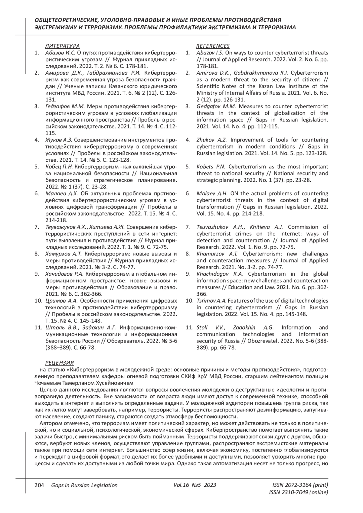 10. Цримов А.А. Особенности применения цифровых технологий в противодействии кибертерроризму // Пробелы в российском законодательстве. 2022. Т. 15. № 4. С. 145-148. EDN: AKRVMA