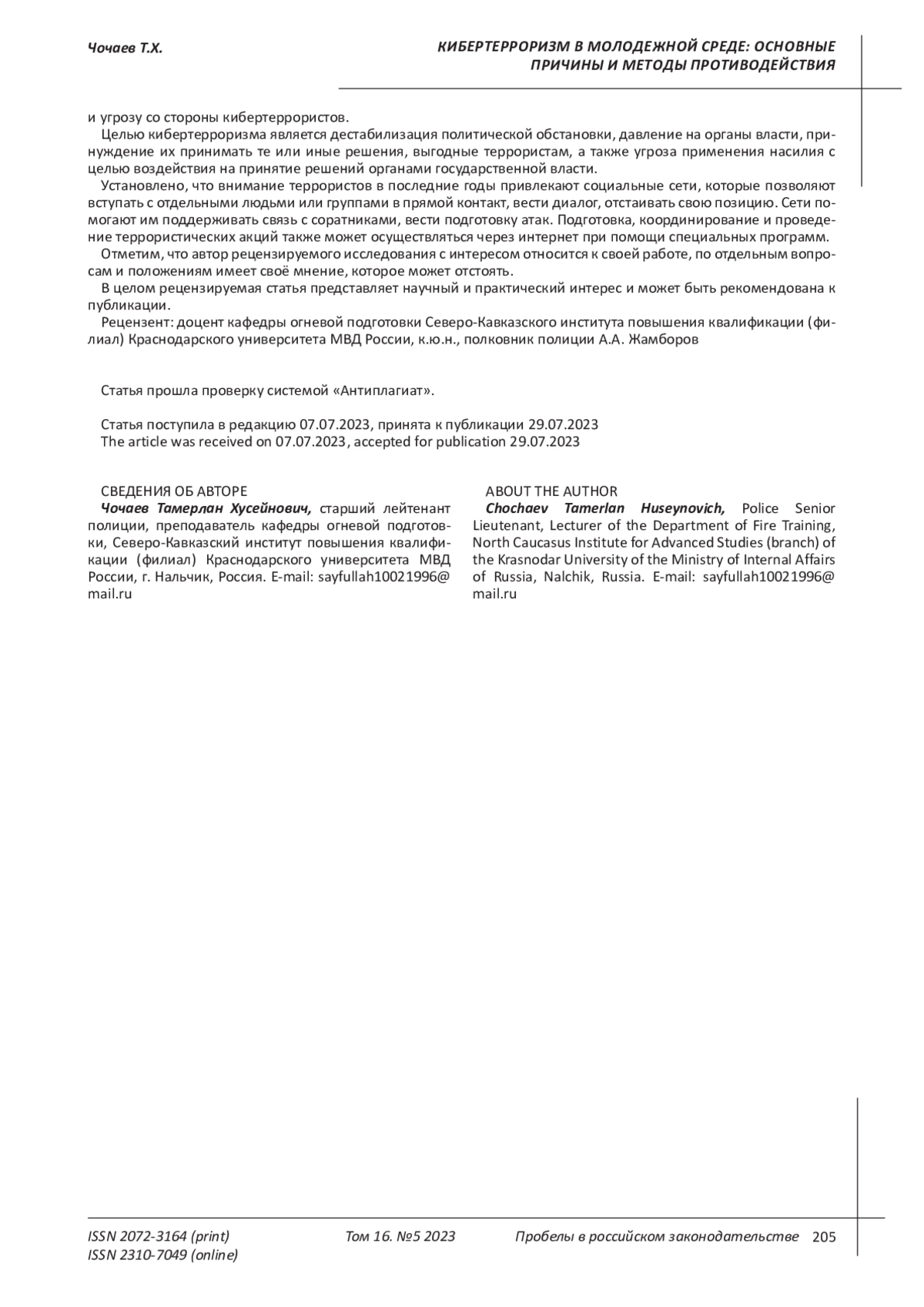 Zhukov A.Z. Improvement of tools for countering cyberterrorism in modern conditions // Gaps in Russian legislation. 2021. Vol. 14. No. 5. pp. 123-128. EDN: LTZAKA