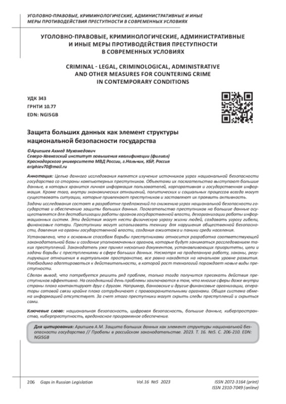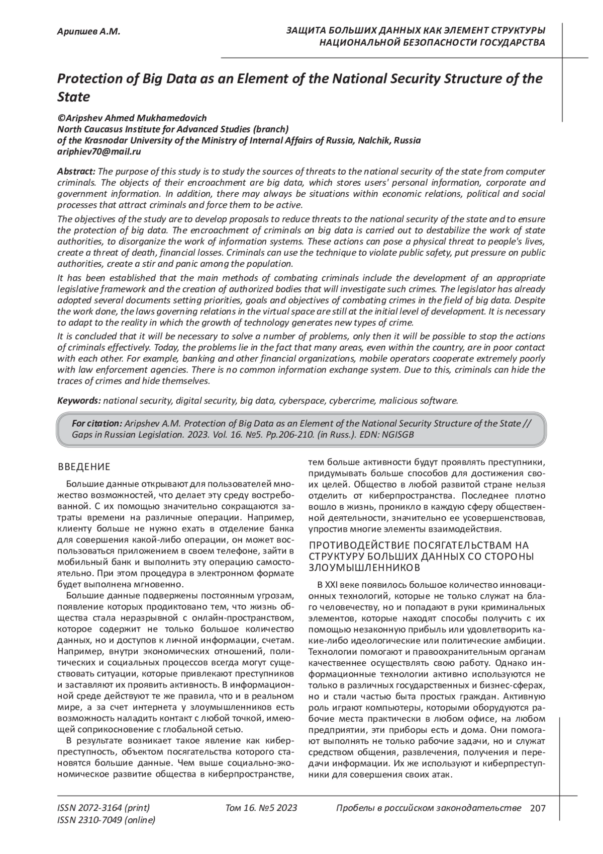Целью данного исследования является изучение источников угроз национальной безопасности государства со стороны компьютерных преступников. Объектами их посягательства выступают большие данные, в которых хранится личная информация пользователей, корпоративная и государственная информация. Кроме того, внутри экономических отношений, политических и социальных процессов всегда могут существовать ситуации, которые привлекают преступников и заставляют их проявить активность. Задачи исследования состоят в разработке предложений по снижению угроз национальной безопасности государства и обеспечению защиты больших данных. Посягательство преступников на большие данные осуществляется для дестабилизации работы органов государственной власти, дезорганизации работы информационных систем. Эти действия могут нести физическую угрозу жизни людей, создавать угрозу гибели, финансовые потери. Преступники могут использовать технику для нарушения общественной безопасности, давления на органы государственной власти, создания ажиотажа и паники среди населения. Установлено, что к основным способам борьбы преступниками относится разработка соответствующей законодательной базы и создание уполномоченных органов, которые будут заниматься расследованием таких преступлений. Законодатель уже принял несколько документов, устанавливающих приоритеты, цели и задачи борьбы с преступлениями в сфере больших данных. Несмотря на проделанную работу, законы, регулирующие отношения в виртуальном пространстве, все равно находятся на начальном уровне развития. Необходимо адаптироваться к действительности, в которой рост технологий порождает новые виды преступности. Сделан вывод, что потребуется решить ряд проблем, только тогда получится пресекать действия преступников эффективно. На сегодняшний день проблемы заключаются в том, что многие сферы даже внутри страны плохо контактируют друг с другом. Например, банковские и другие финансовые организации, операторы сотовой связи крайне плохо сотрудничают с правоохранительными органами. Общая система обмена информацией отсутствует. За счет этого преступники могут скрыть следы преступлений и скрыться сами