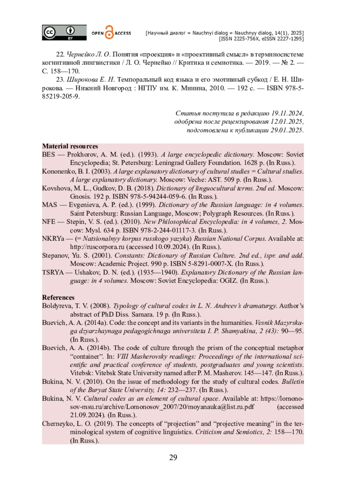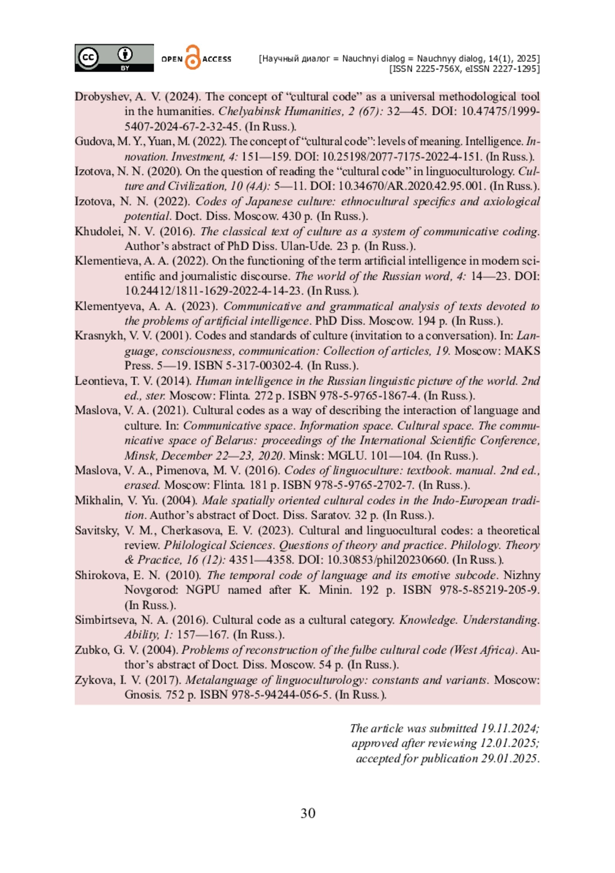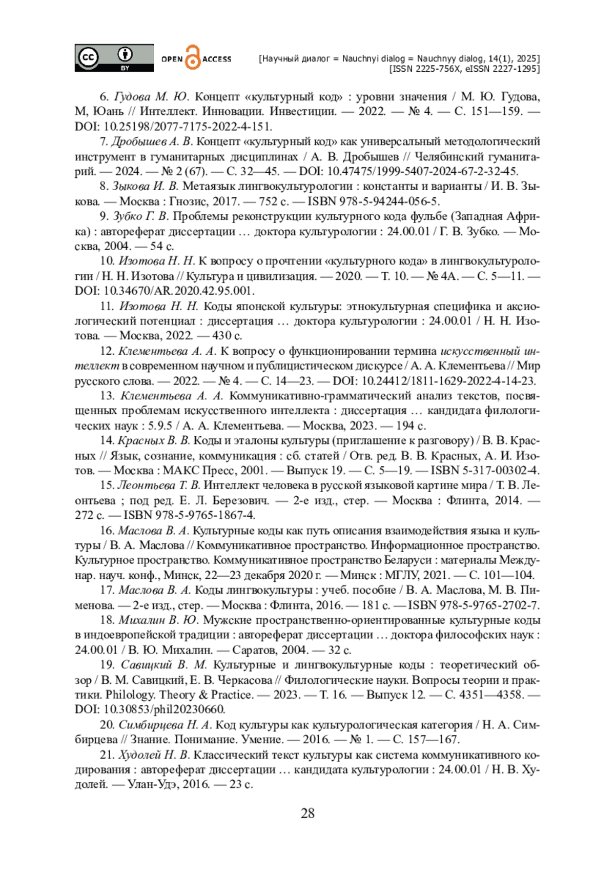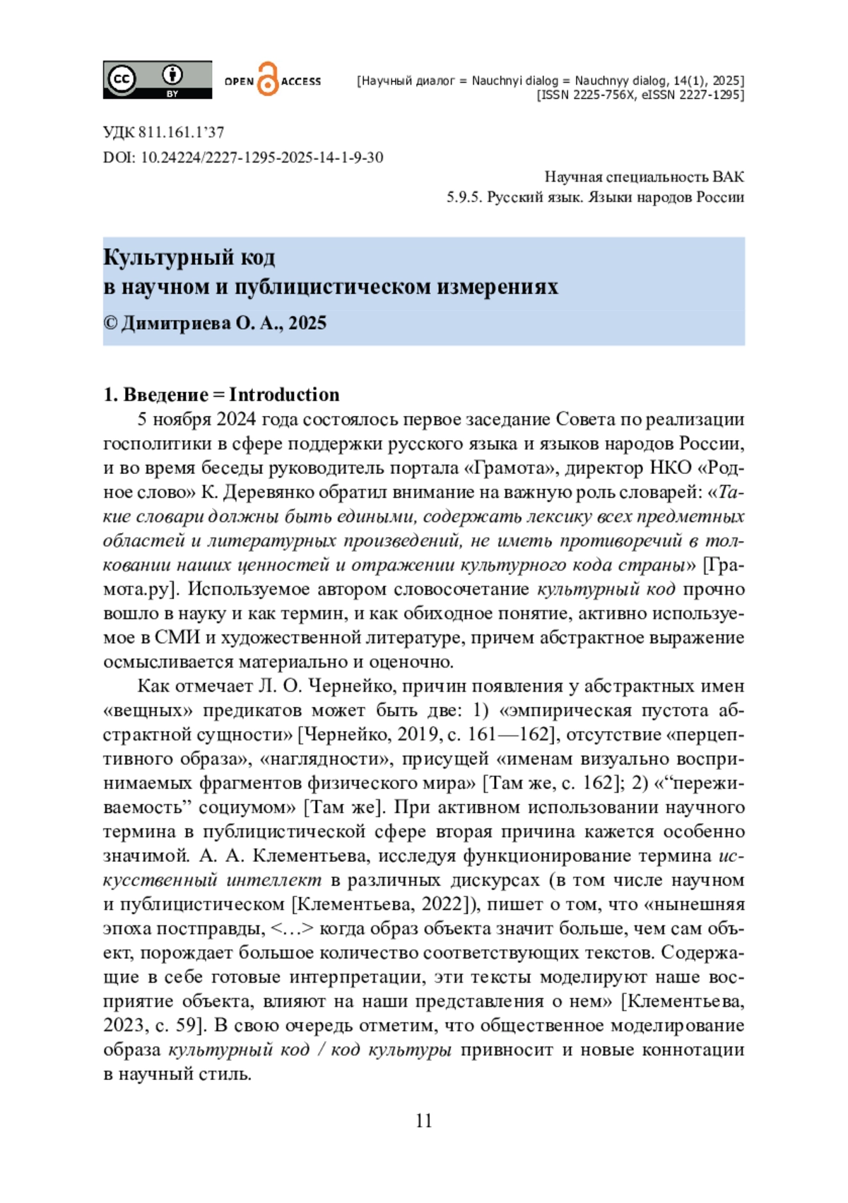 ДИМИТРИЕВА О. А. КУЛЬТУРНЫЙ КОД В НАУЧНОМ И ПУБЛИЦИСТИЧЕСКОМ ИЗМЕРЕНИЯХ // НАУЧНЫЙ ДИАЛОГ. 2025. ТОМ 14, № 1
