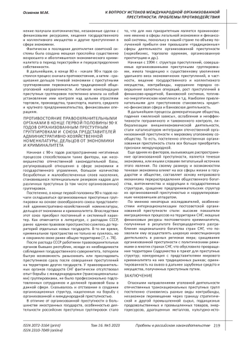 Постепенно, в конце первой половины 90-х годов начали складываться организованные преступные группировки на основе своеобразного союза представителей административно-хозяйственной номенклатуры, дельцов от экономики и криминалитета. Впоследствии этот союз приобрел постоянный и системный характер. Как отмечается в литературе, с распадом СССР, ранее единое правовое пространство сузилось до территорий отдельных новых государств. В то же время, криминальное пространство не только не сузилось, но и сохранило свою ранее общую территорию [7, c. 78].