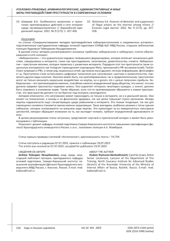 10. Шевцова В.А. Особенности выявления и пресечения противоправных действий в сети интернет среди несовершеннолетних // Евразийский юридический журнал. 2022. № 9 (172). С. 427-428. EDN: ENVCWB