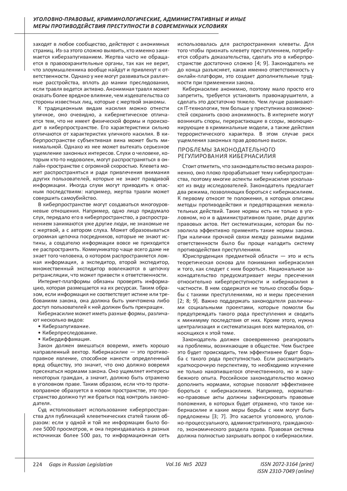 Целью данного исследования было изучение возникновения новых субкультур в глобальном информационном пространстве, связанных с кибернасилием и киберзапугиванием пользователей сети. Кибернасилие - преступное явление, которое появилось с развитием интернета. Породили этот тип преступности такие социальные инструменты как Instagram (принадлежит корпорации Meta, признанной в РФ экстремистской), Twitter (тоже запрещен в РФ), а также ряд социальных сетей, где можно выкладывать личную информацию, фотографии и т. д. Преступники стали использовать цифровые технологии для запугивания, шантажа и вымогательства, применять другие виды насилия. Статистическими данными подтверждается, что 7 из 10 опрошенных подвергались насилию в интернете. Чаще всего это было киберзапугивание. Киберзапугивание унижает достоинство жертвы, высмеивает ее публично, часто к таким издевательствам в онлайн-пространстве присоединяются другие пользователи. Они оставляют комментарии, делятся запугивающим контентом. Установлено, что законодательство весьма разрозненно, оно плохо прорабатывает тему киберпространства, поэтому многие аспекты кибернасилия ускользают из виду исследователей. Законодатель предлагает два режима, позволяющих бороться с кибернасилием. К первому относят те положения, в которых описаны методы противодействия и предотвращения нежелательных действий. Такие нормы есть не только в уголовном, но и в административном праве, ряде других правовых актов. Отсюда следует, что российское законодательство можно дополнить нормами, которые позволят эффективнее бороться с кибернасилием. Например, нормативно-правовые акты должны зафиксировать правовые положения, в которых будет отражено, что такое кибернасилие и какие меры борьбы с ним могут быть предложены. Это касается уголовного, уголовно-процессуального, административного, гражданского, экономического раздела права. Правовая система должна полностью закрывать вопрос о кибернасилии. Кроме того, важно поддержать законодателя различными социальными проектами, которые помогли бы предупреждать такого рода преступления и сводить к минимуму последствия от них. Кроме этого, нужна централизация и систематизация всех материалов, относящихся к этой теме.