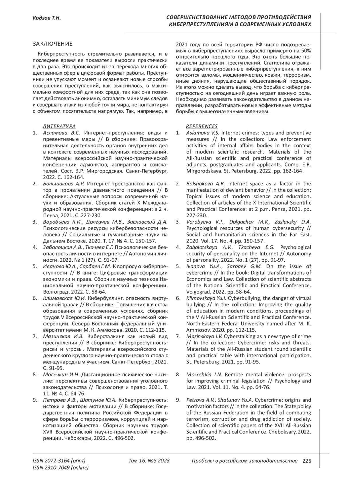 5. Иванова Ю.А., Сарбаев Г.М. К вопросу о киберпреступности // В книге: Цифровые трансформации экономики и права. Сборник научных тезисов Национальной научно-практической конференции. Волгоград, 2022. С. 58-64. EDN: EHLIBD