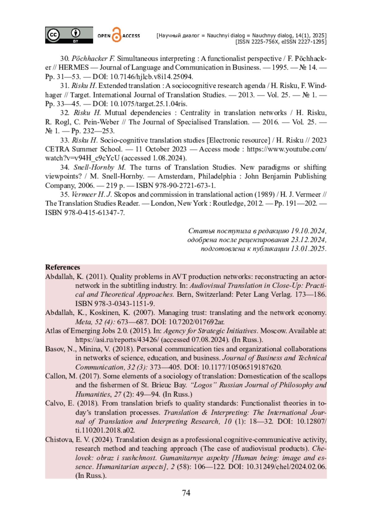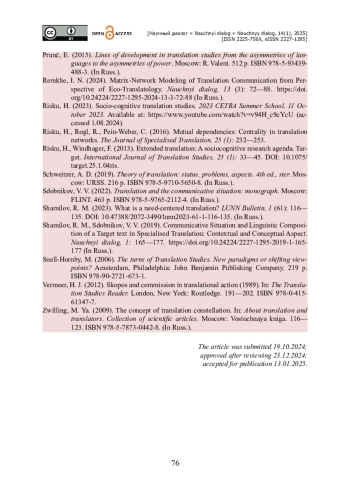 14. Чистова Е. В. Переводческий дизайн как профессиональная когнитивно-коммуникативная деятельность, метод исследования и дидактическая практика (на материале аудиовизуальных произведений) / Е. В. Чистова // Человек : образ и сущность. Гуманитарные аспекты. - 2024. - № 2 (58). - С. 106-122. - https://doi.org/10.31249/chel/2024.02.06.