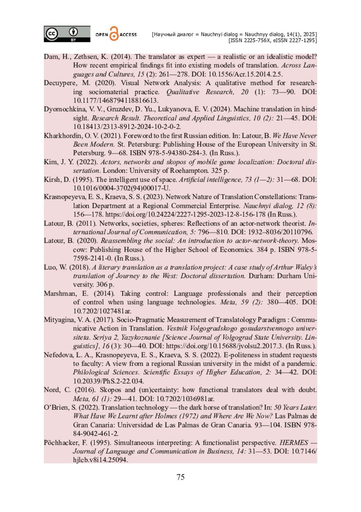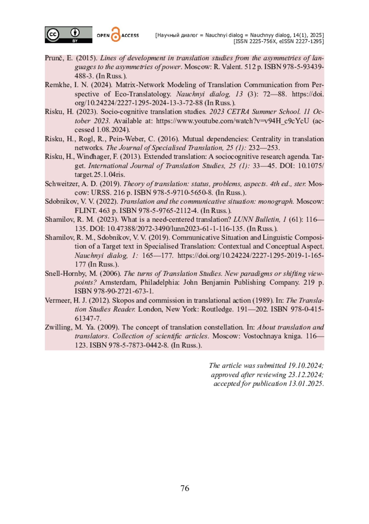 7. Ремхе И. Н. Матрично-сетевое моделирование переводческой коммуникации с позиции экотранслатологии / И. Н. Ремхе // Научный диалог. - 2024. - Т. 13. - № 3. - С. 72-88. - https://doi.org/10.24224/2227-1295-2024-13-3-72-88.